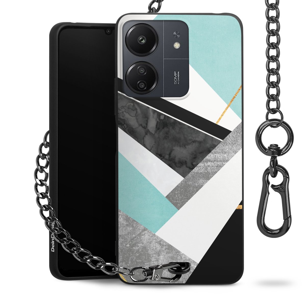 Die mattschwarze Silikon-Handyhülle besteht aus robustem TPU (thermoplastisches Polyurethan). Sie ist flexibel und schützt Dein Smartphone vor Stößen und Kratzern. Die Kette sowie der Karabinerhaken sind aus Metall in Gunmetal-Optik gefertigt. Für dieses Produkt kommen ausschließlich TÜV-geprüfte Materialien zum Einsatz.