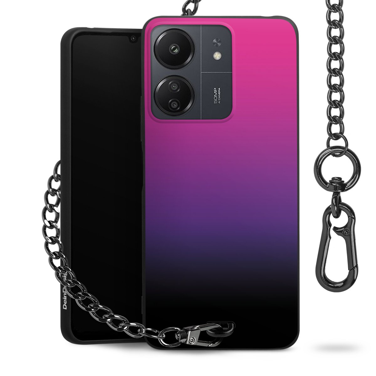 Die mattschwarze Silikon-Handyhülle besteht aus robustem TPU (thermoplastisches Polyurethan). Sie ist flexibel und schützt Dein Smartphone vor Stößen und Kratzern. Die Kette sowie der Karabinerhaken sind aus Metall in Gunmetal-Optik gefertigt. Für dieses Produkt kommen ausschließlich TÜV-geprüfte Materialien zum Einsatz.