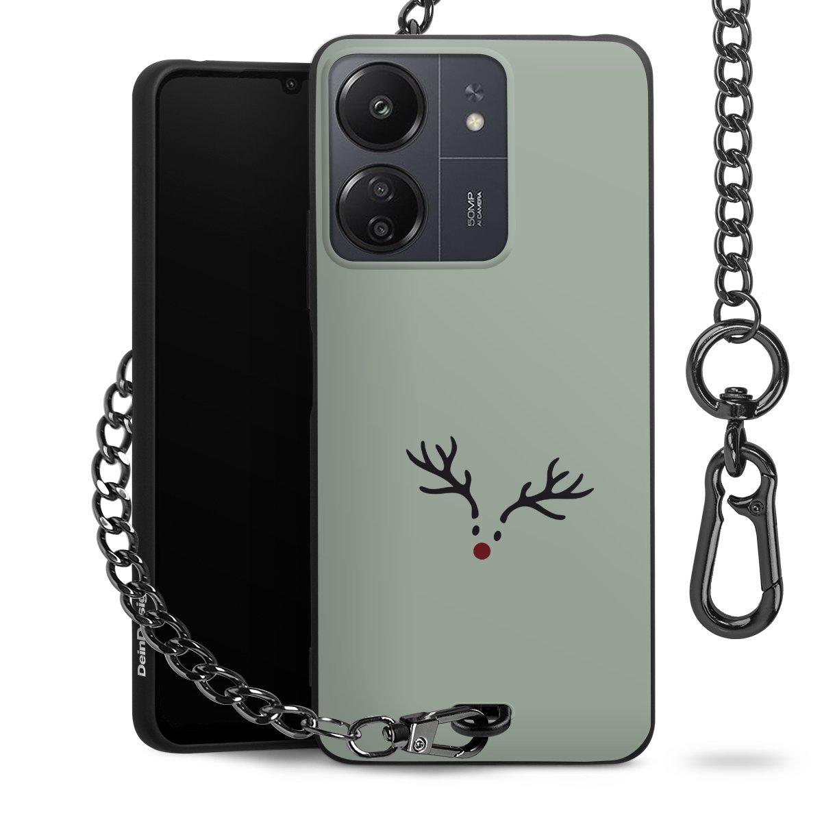 Die Handyhülle verfügt über eine mittig am unteren Rand platzierte Öse, an der die Metallkette stabil befestigt ist. Bestelle die Hülle einfach für Dein Smartphone-Modell, dann passt sie wie angegossen und Du brauchst sie bloß einmal anzudrücken. Handy in die Tasche, Karabiner an den Hosenbund – schon kann die Party starten.