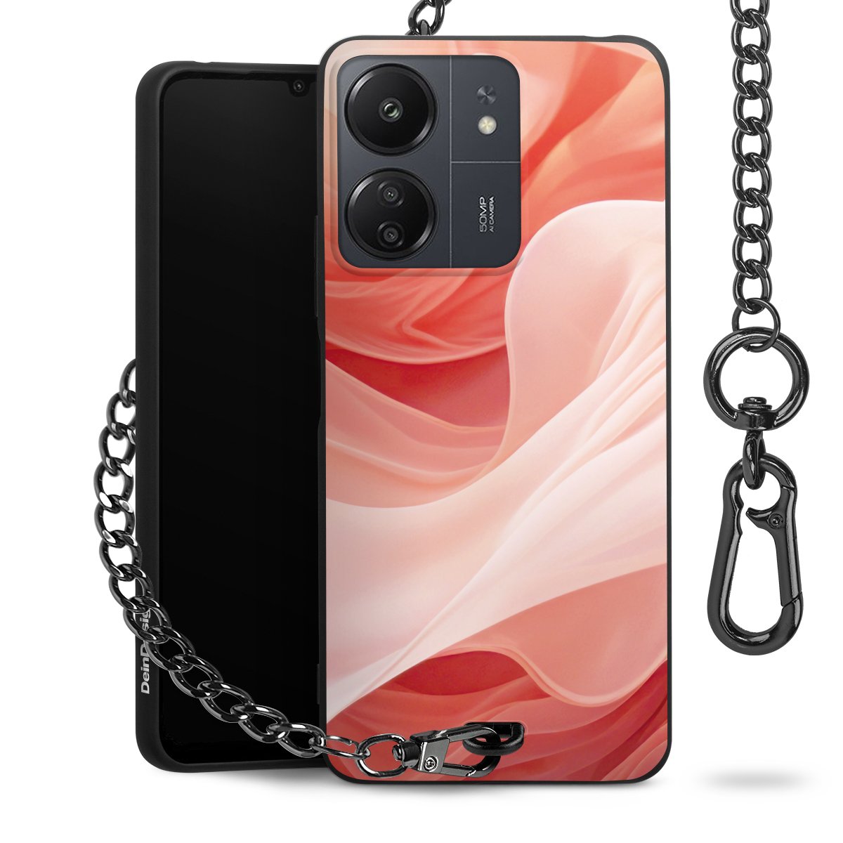 Die mattschwarze Silikon-Handyhülle besteht aus robustem TPU (thermoplastisches Polyurethan). Sie ist flexibel und schützt Dein Smartphone vor Stößen und Kratzern. Die Kette sowie der Karabinerhaken sind aus Metall in Gunmetal-Optik gefertigt. Für dieses Produkt kommen ausschließlich TÜV-geprüfte Materialien zum Einsatz.