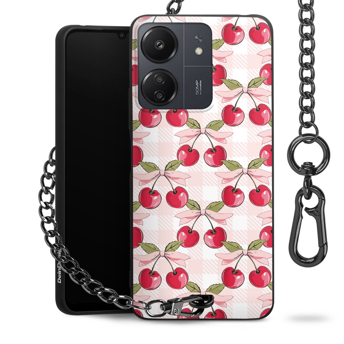 Die mattschwarze Silikon-Handyhülle besteht aus robustem TPU (thermoplastisches Polyurethan). Sie ist flexibel und schützt Dein Smartphone vor Stößen und Kratzern. Die Kette sowie der Karabinerhaken sind aus Metall in Gunmetal-Optik gefertigt. Für dieses Produkt kommen ausschließlich TÜV-geprüfte Materialien zum Einsatz.