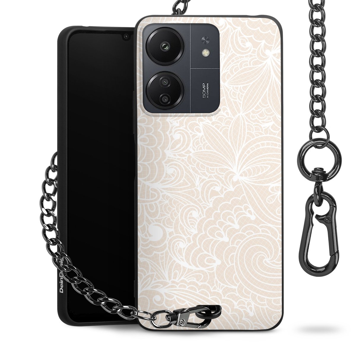 Die mattschwarze Silikon-Handyhülle besteht aus robustem TPU (thermoplastisches Polyurethan). Sie ist flexibel und schützt Dein Smartphone vor Stößen und Kratzern. Die Kette sowie der Karabinerhaken sind aus Metall in Gunmetal-Optik gefertigt. Für dieses Produkt kommen ausschließlich TÜV-geprüfte Materialien zum Einsatz.