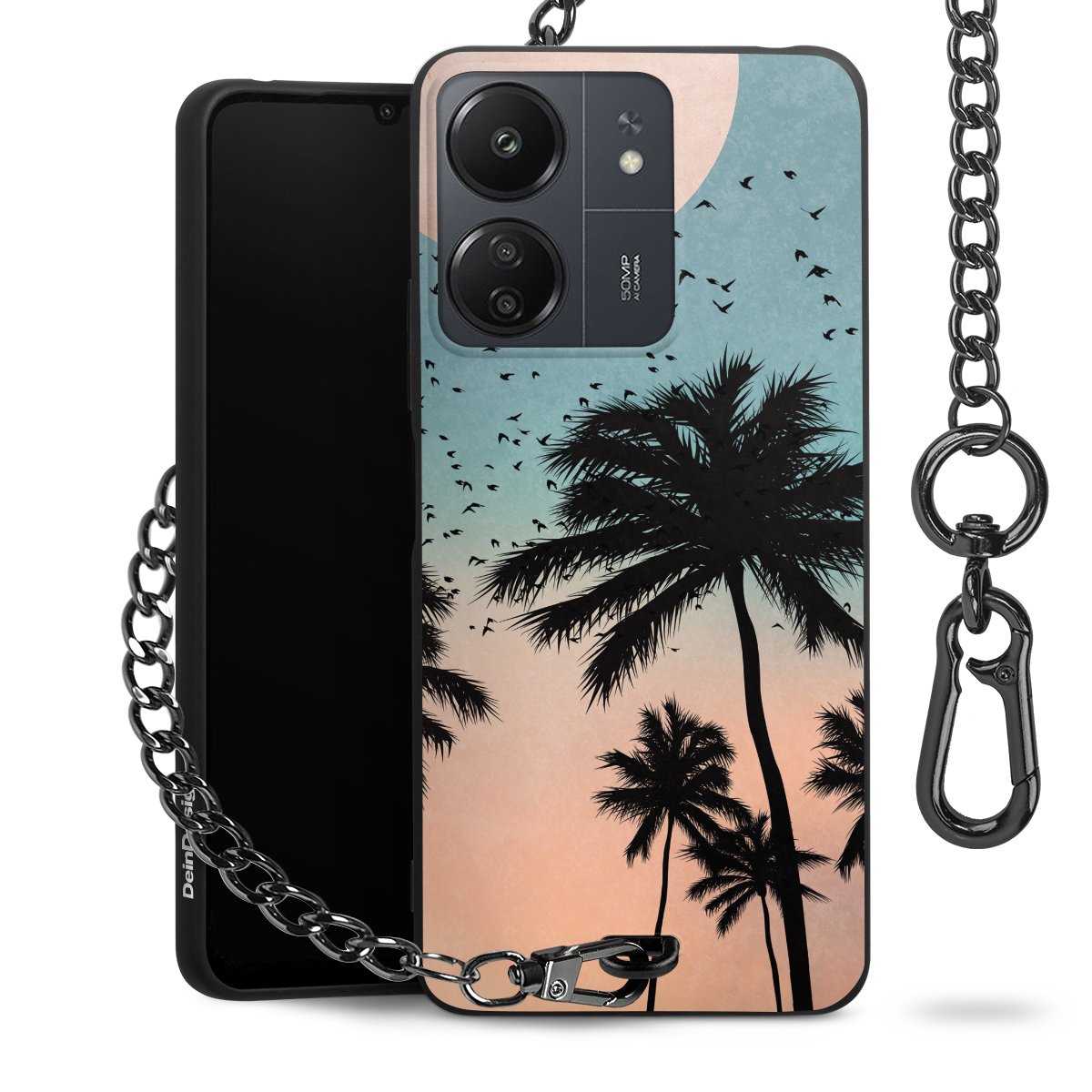 Die mattschwarze Silikon-Handyhülle besteht aus robustem TPU (thermoplastisches Polyurethan). Sie ist flexibel und schützt Dein Smartphone vor Stößen und Kratzern. Die Kette sowie der Karabinerhaken sind aus Metall in Gunmetal-Optik gefertigt. Für dieses Produkt kommen ausschließlich TÜV-geprüfte Materialien zum Einsatz.