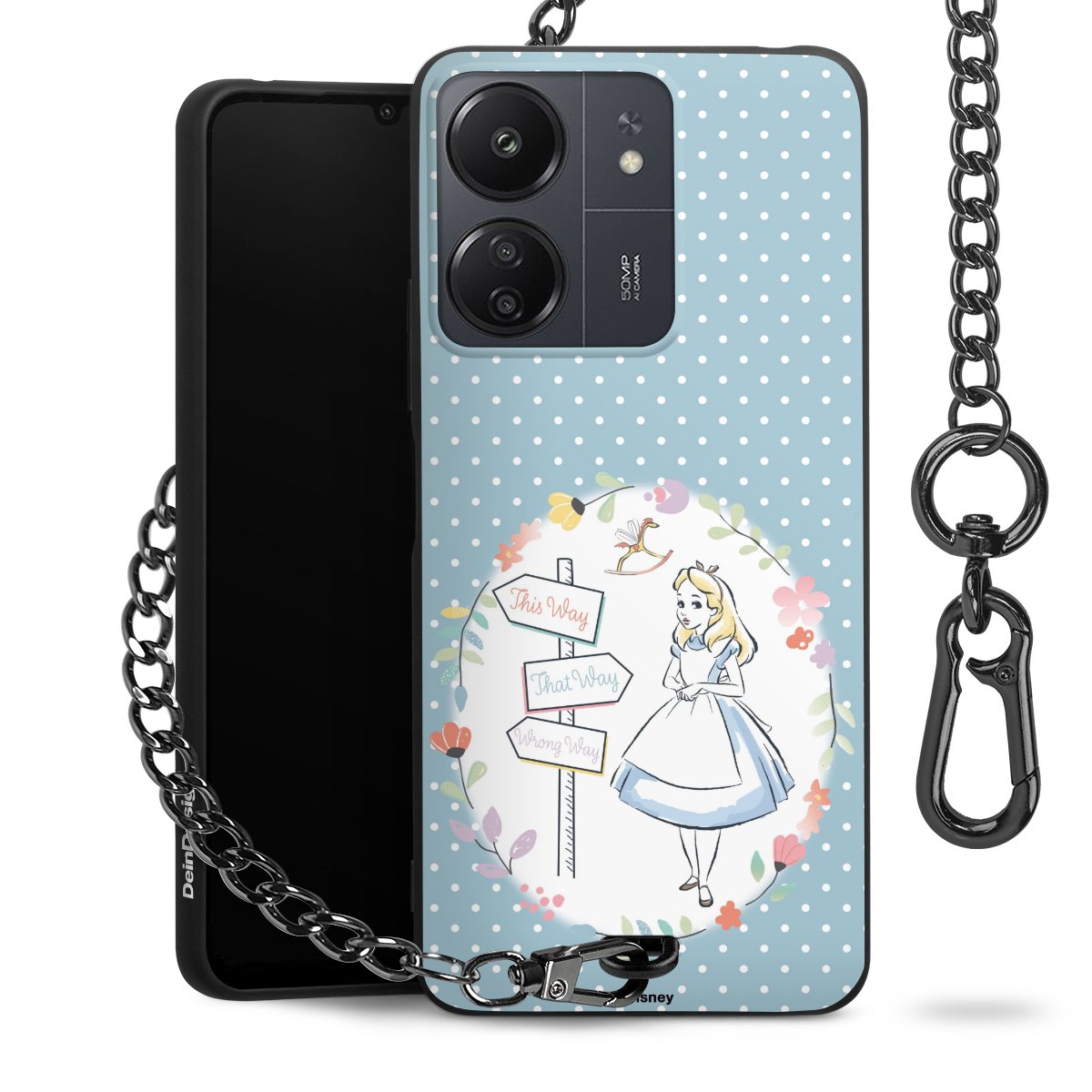Die Handyhülle verfügt über eine mittig am unteren Rand platzierte Öse, an der die Metallkette stabil befestigt ist. Bestelle die Hülle einfach für Dein Smartphone-Modell, dann passt sie wie angegossen und Du brauchst sie bloß einmal anzudrücken. Handy in die Tasche, Karabiner an den Hosenbund – schon kann die Party starten.