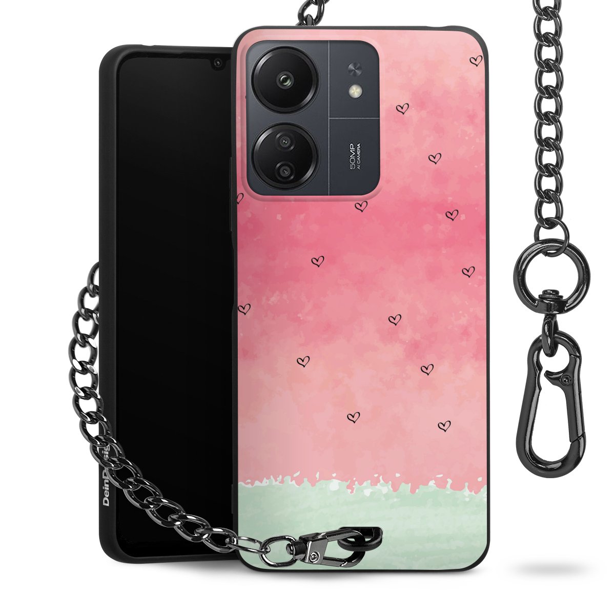 Die mattschwarze Silikon-Handyhülle besteht aus robustem TPU (thermoplastisches Polyurethan). Sie ist flexibel und schützt Dein Smartphone vor Stößen und Kratzern. Die Kette sowie der Karabinerhaken sind aus Metall in Gunmetal-Optik gefertigt. Für dieses Produkt kommen ausschließlich TÜV-geprüfte Materialien zum Einsatz.