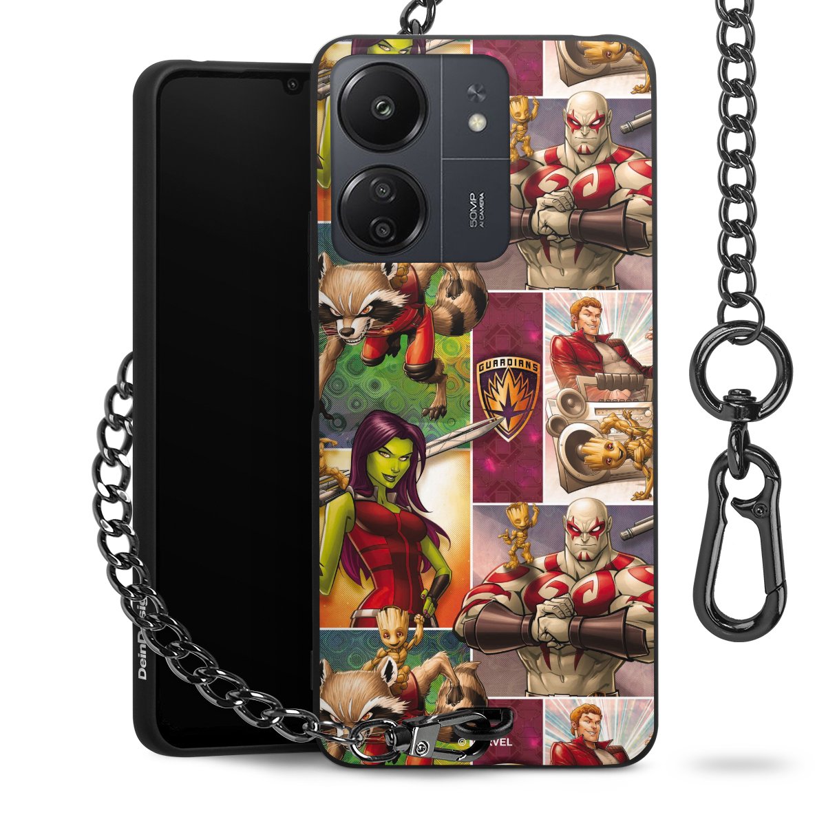Die mattschwarze Silikon-Handyhülle besteht aus robustem TPU (thermoplastisches Polyurethan). Sie ist flexibel und schützt Dein Smartphone vor Stößen und Kratzern. Die Kette sowie der Karabinerhaken sind aus Metall in Gunmetal-Optik gefertigt. Für dieses Produkt kommen ausschließlich TÜV-geprüfte Materialien zum Einsatz.