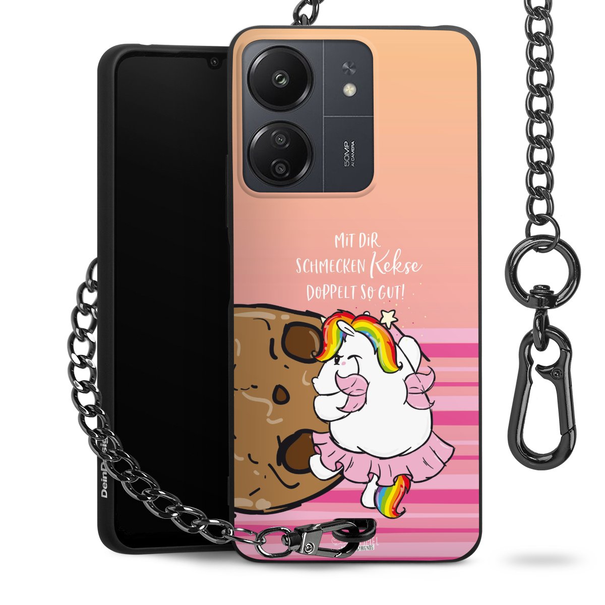 Die mattschwarze Silikon-Handyhülle besteht aus robustem TPU (thermoplastisches Polyurethan). Sie ist flexibel und schützt Dein Smartphone vor Stößen und Kratzern. Die Kette sowie der Karabinerhaken sind aus Metall in Gunmetal-Optik gefertigt. Für dieses Produkt kommen ausschließlich TÜV-geprüfte Materialien zum Einsatz.