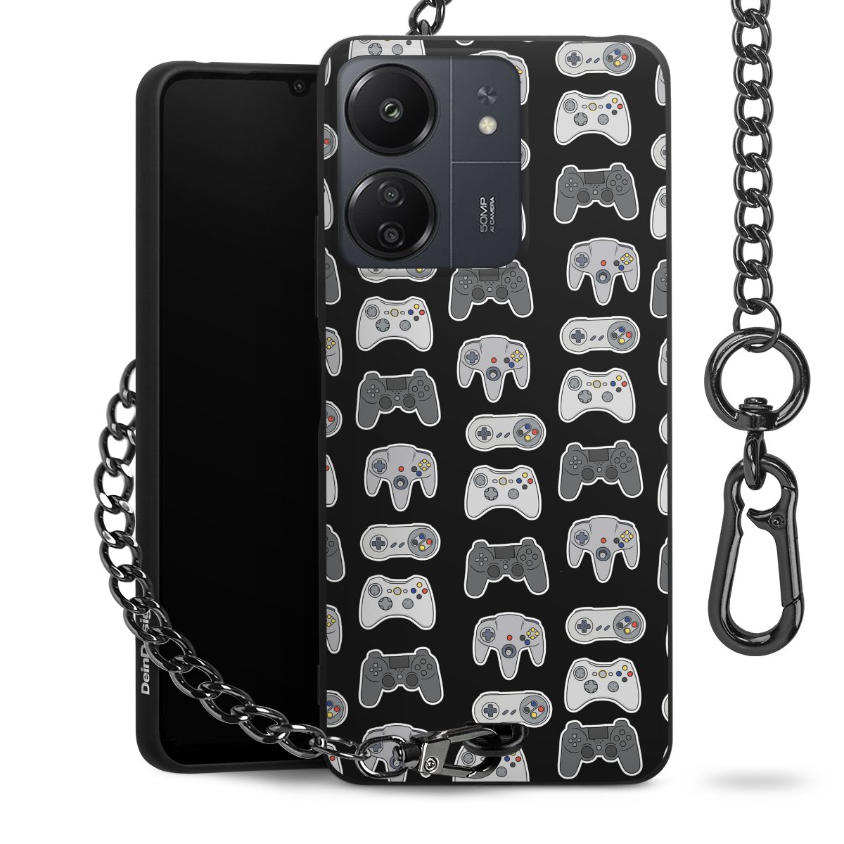 Die mattschwarze Silikon-Handyhülle besteht aus robustem TPU (thermoplastisches Polyurethan). Sie ist flexibel und schützt Dein Smartphone vor Stößen und Kratzern. Die Kette sowie der Karabinerhaken sind aus Metall in Gunmetal-Optik gefertigt. Für dieses Produkt kommen ausschließlich TÜV-geprüfte Materialien zum Einsatz.