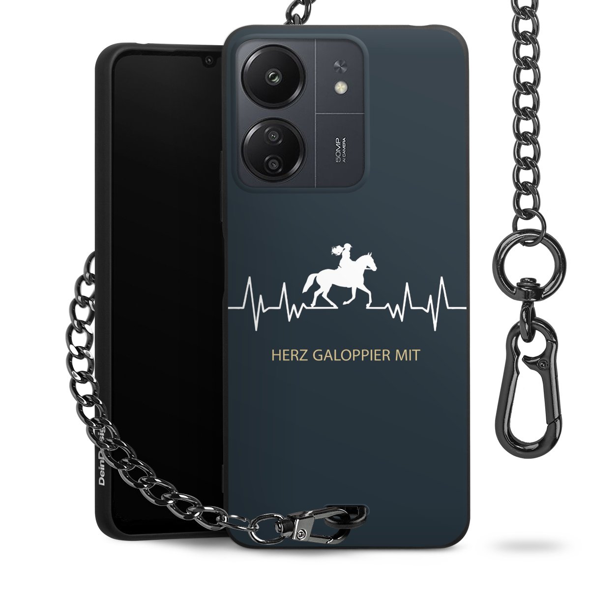 Die mattschwarze Silikon-Handyhülle besteht aus robustem TPU (thermoplastisches Polyurethan). Sie ist flexibel und schützt Dein Smartphone vor Stößen und Kratzern. Die Kette sowie der Karabinerhaken sind aus Metall in Gunmetal-Optik gefertigt. Für dieses Produkt kommen ausschließlich TÜV-geprüfte Materialien zum Einsatz.