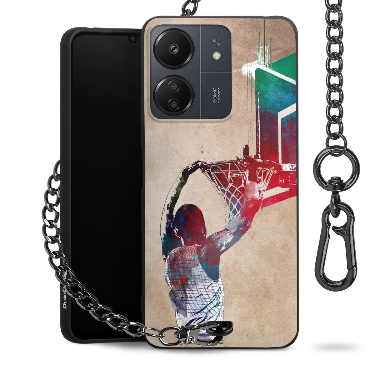 Die mattschwarze Silikon-Handyhülle besteht aus robustem TPU (thermoplastisches Polyurethan). Sie ist flexibel und schützt Dein Smartphone vor Stößen und Kratzern. Die Kette sowie der Karabinerhaken sind aus Metall in Gunmetal-Optik gefertigt. Für dieses Produkt kommen ausschließlich TÜV-geprüfte Materialien zum Einsatz.