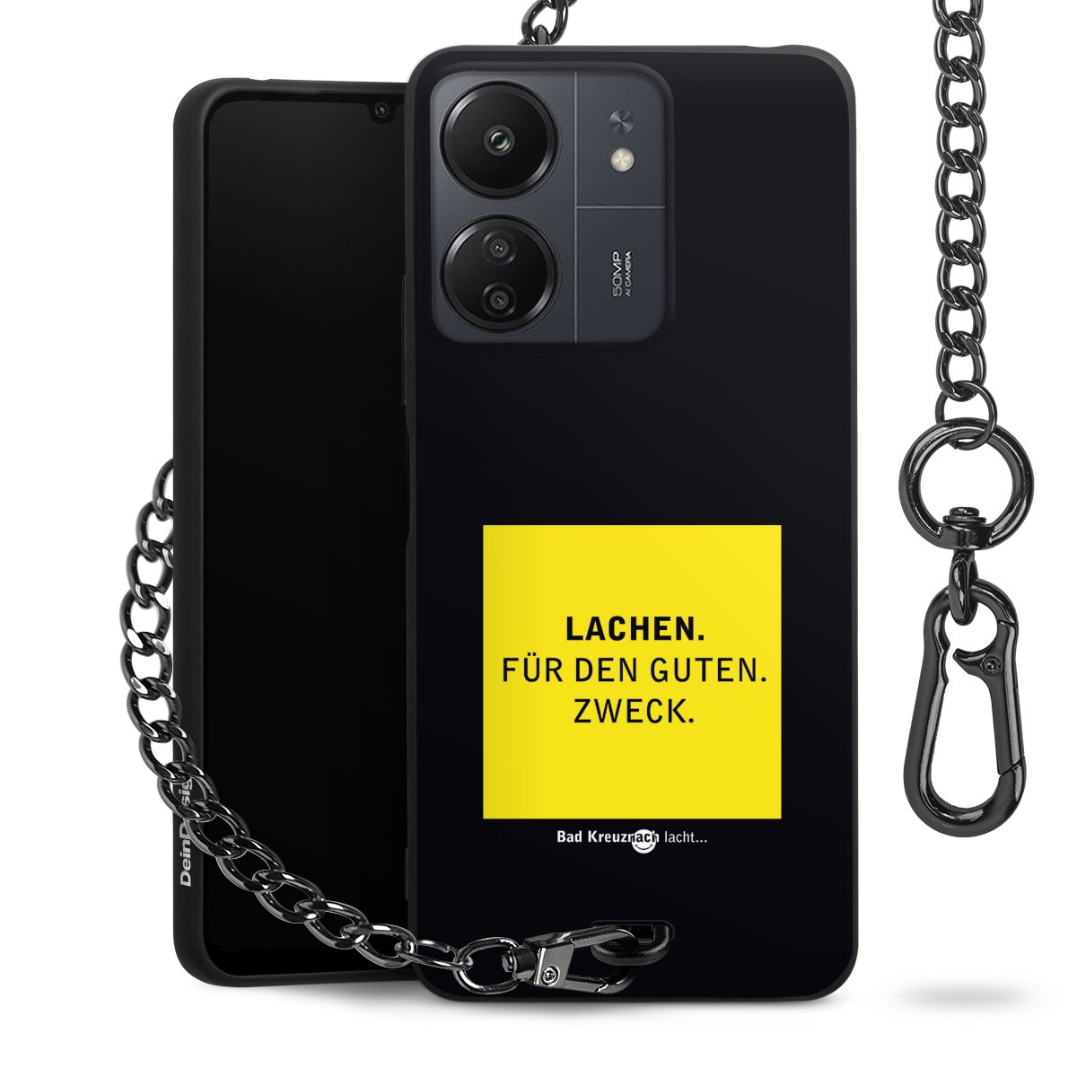 Die mattschwarze Silikon-Handyhülle besteht aus robustem TPU (thermoplastisches Polyurethan). Sie ist flexibel und schützt Dein Smartphone vor Stößen und Kratzern. Die Kette sowie der Karabinerhaken sind aus Metall in Gunmetal-Optik gefertigt. Für dieses Produkt kommen ausschließlich TÜV-geprüfte Materialien zum Einsatz.