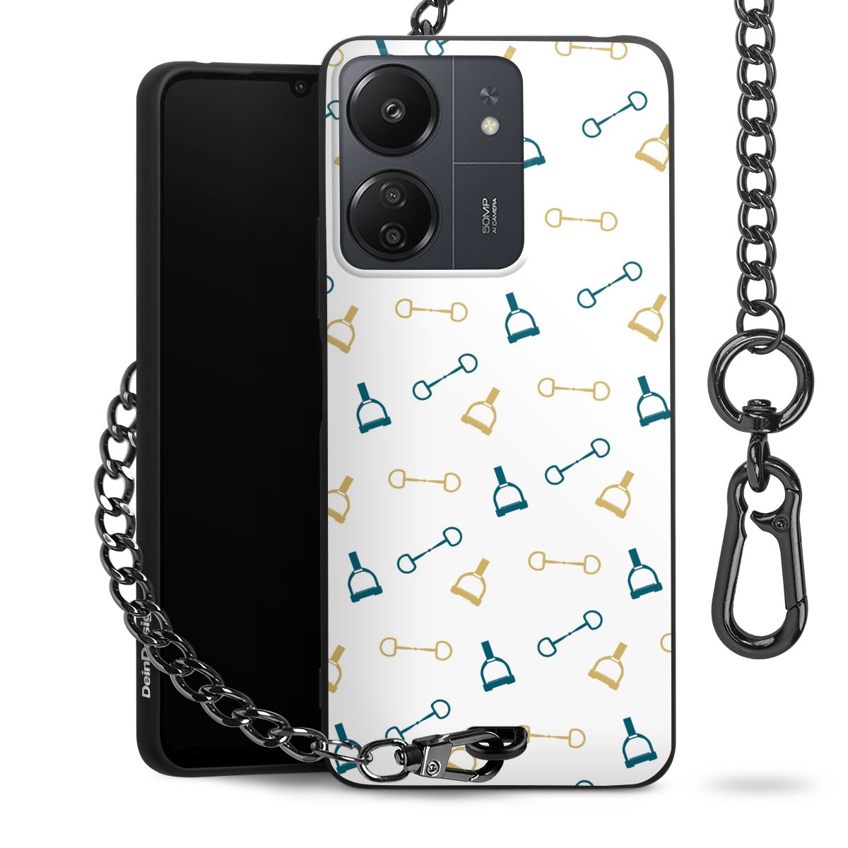Die Handyhülle verfügt über eine mittig am unteren Rand platzierte Öse, an der die Metallkette stabil befestigt ist. Bestelle die Hülle einfach für Dein Smartphone-Modell, dann passt sie wie angegossen und Du brauchst sie bloß einmal anzudrücken. Handy in die Tasche, Karabiner an den Hosenbund – schon kann die Party starten.