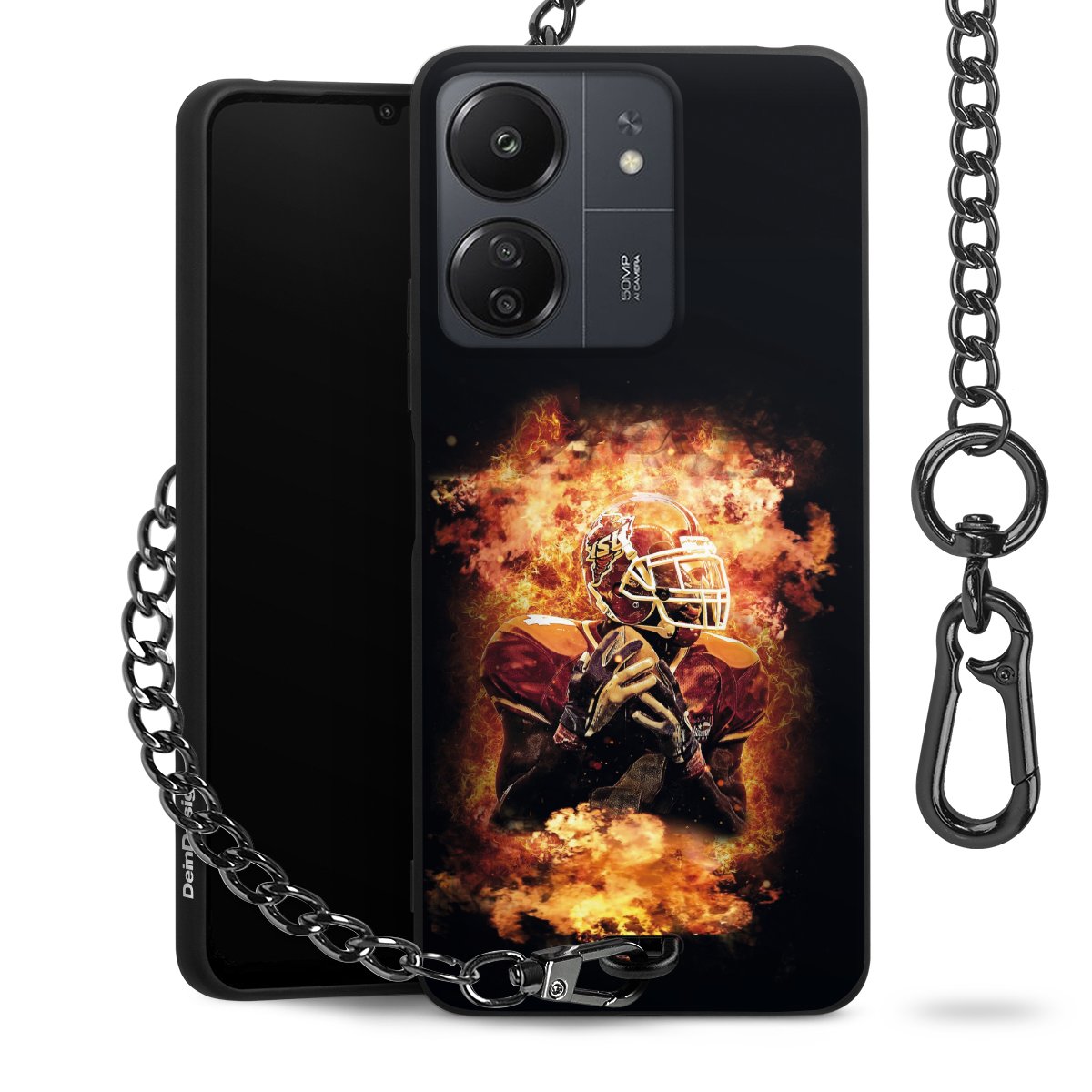 Die mattschwarze Silikon-Handyhülle besteht aus robustem TPU (thermoplastisches Polyurethan). Sie ist flexibel und schützt Dein Smartphone vor Stößen und Kratzern. Die Kette sowie der Karabinerhaken sind aus Metall in Gunmetal-Optik gefertigt. Für dieses Produkt kommen ausschließlich TÜV-geprüfte Materialien zum Einsatz.
