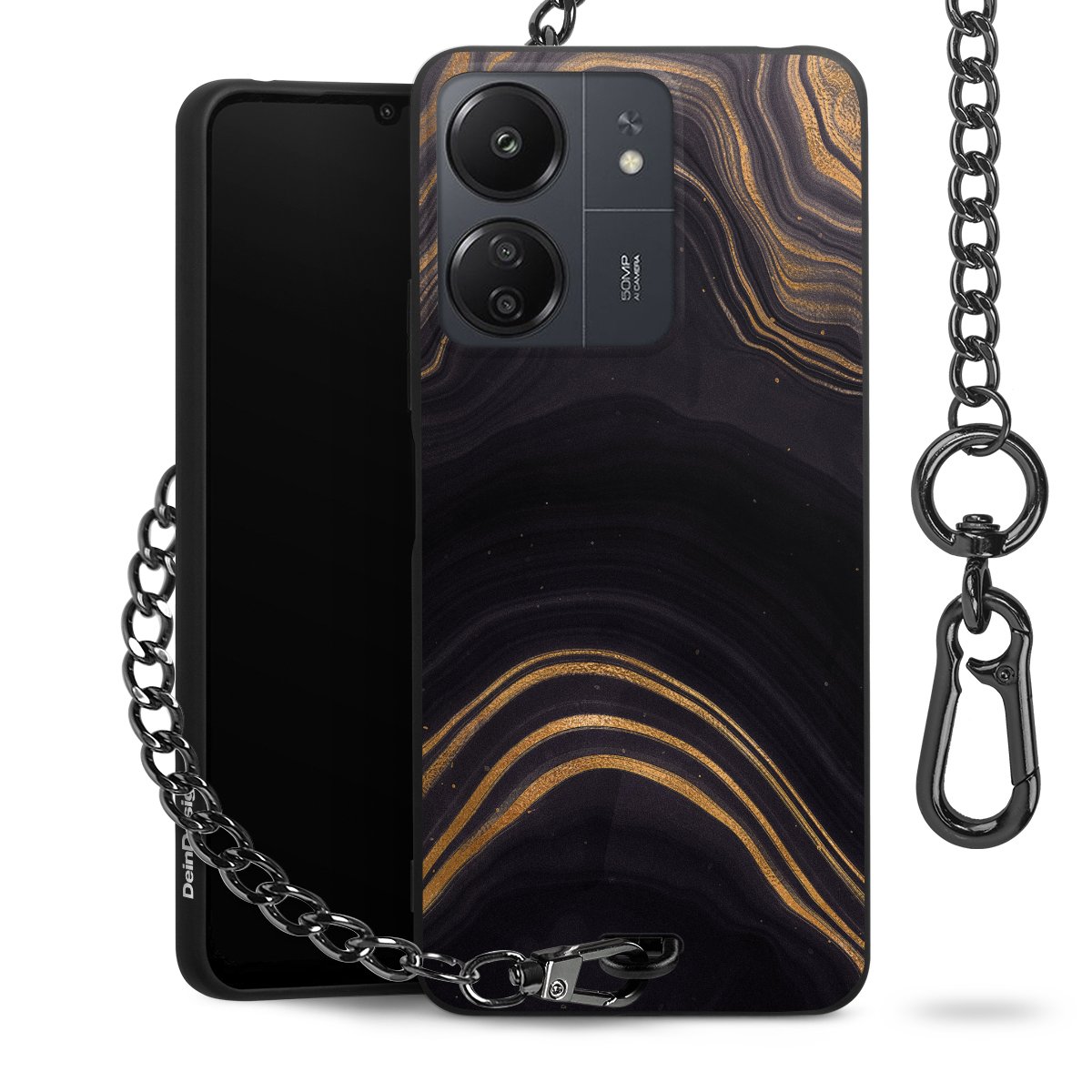 Die mattschwarze Silikon-Handyhülle besteht aus robustem TPU (thermoplastisches Polyurethan). Sie ist flexibel und schützt Dein Smartphone vor Stößen und Kratzern. Die Kette sowie der Karabinerhaken sind aus Metall in Gunmetal-Optik gefertigt. Für dieses Produkt kommen ausschließlich TÜV-geprüfte Materialien zum Einsatz.