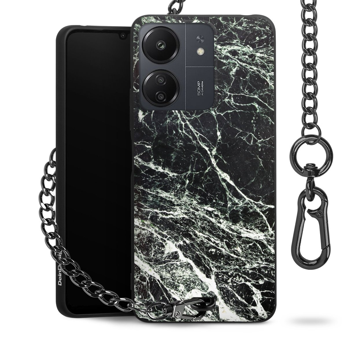 Die mattschwarze Silikon-Handyhülle besteht aus robustem TPU (thermoplastisches Polyurethan). Sie ist flexibel und schützt Dein Smartphone vor Stößen und Kratzern. Die Kette sowie der Karabinerhaken sind aus Metall in Gunmetal-Optik gefertigt. Für dieses Produkt kommen ausschließlich TÜV-geprüfte Materialien zum Einsatz.