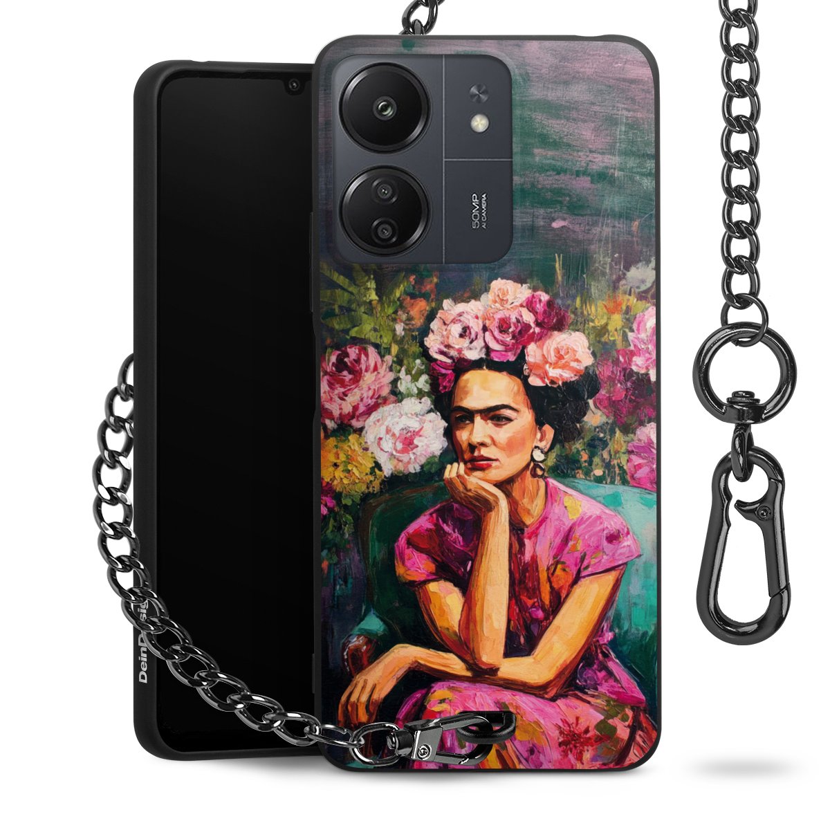 Die mattschwarze Silikon-Handyhülle besteht aus robustem TPU (thermoplastisches Polyurethan). Sie ist flexibel und schützt Dein Smartphone vor Stößen und Kratzern. Die Kette sowie der Karabinerhaken sind aus Metall in Gunmetal-Optik gefertigt. Für dieses Produkt kommen ausschließlich TÜV-geprüfte Materialien zum Einsatz.