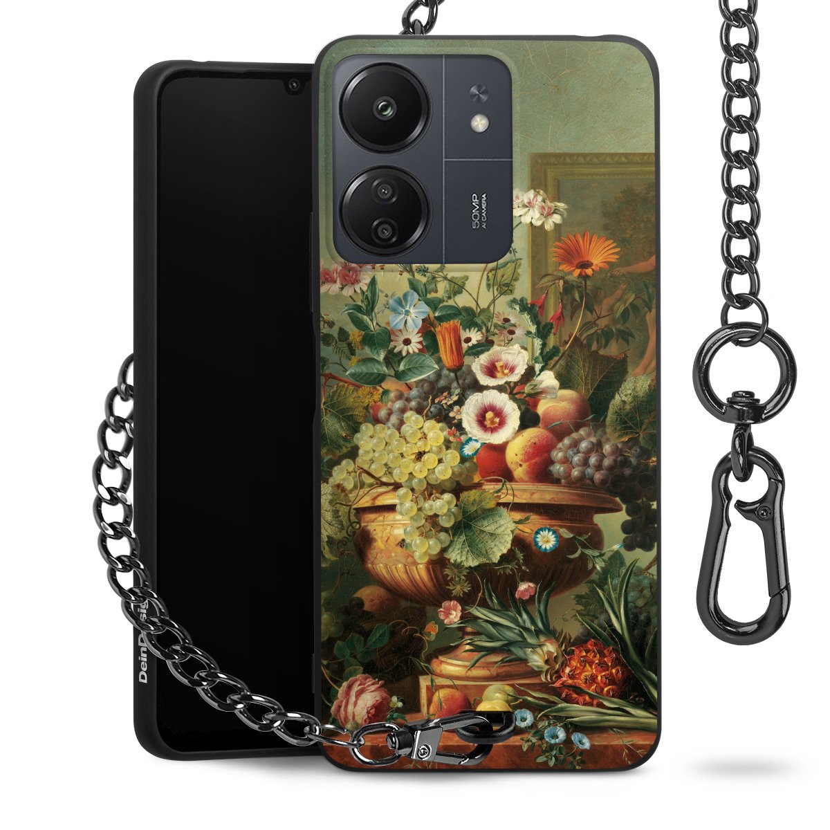 Die mattschwarze Silikon-Handyhülle besteht aus robustem TPU (thermoplastisches Polyurethan). Sie ist flexibel und schützt Dein Smartphone vor Stößen und Kratzern. Die Kette sowie der Karabinerhaken sind aus Metall in Gunmetal-Optik gefertigt. Für dieses Produkt kommen ausschließlich TÜV-geprüfte Materialien zum Einsatz.