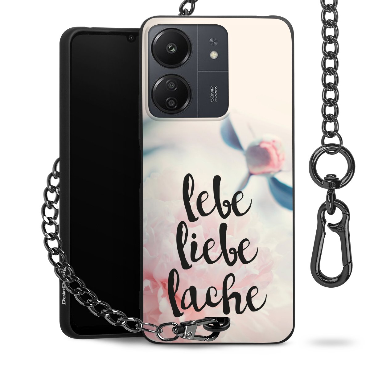 Die mattschwarze Silikon-Handyhülle besteht aus robustem TPU (thermoplastisches Polyurethan). Sie ist flexibel und schützt Dein Smartphone vor Stößen und Kratzern. Die Kette sowie der Karabinerhaken sind aus Metall in Gunmetal-Optik gefertigt. Für dieses Produkt kommen ausschließlich TÜV-geprüfte Materialien zum Einsatz.