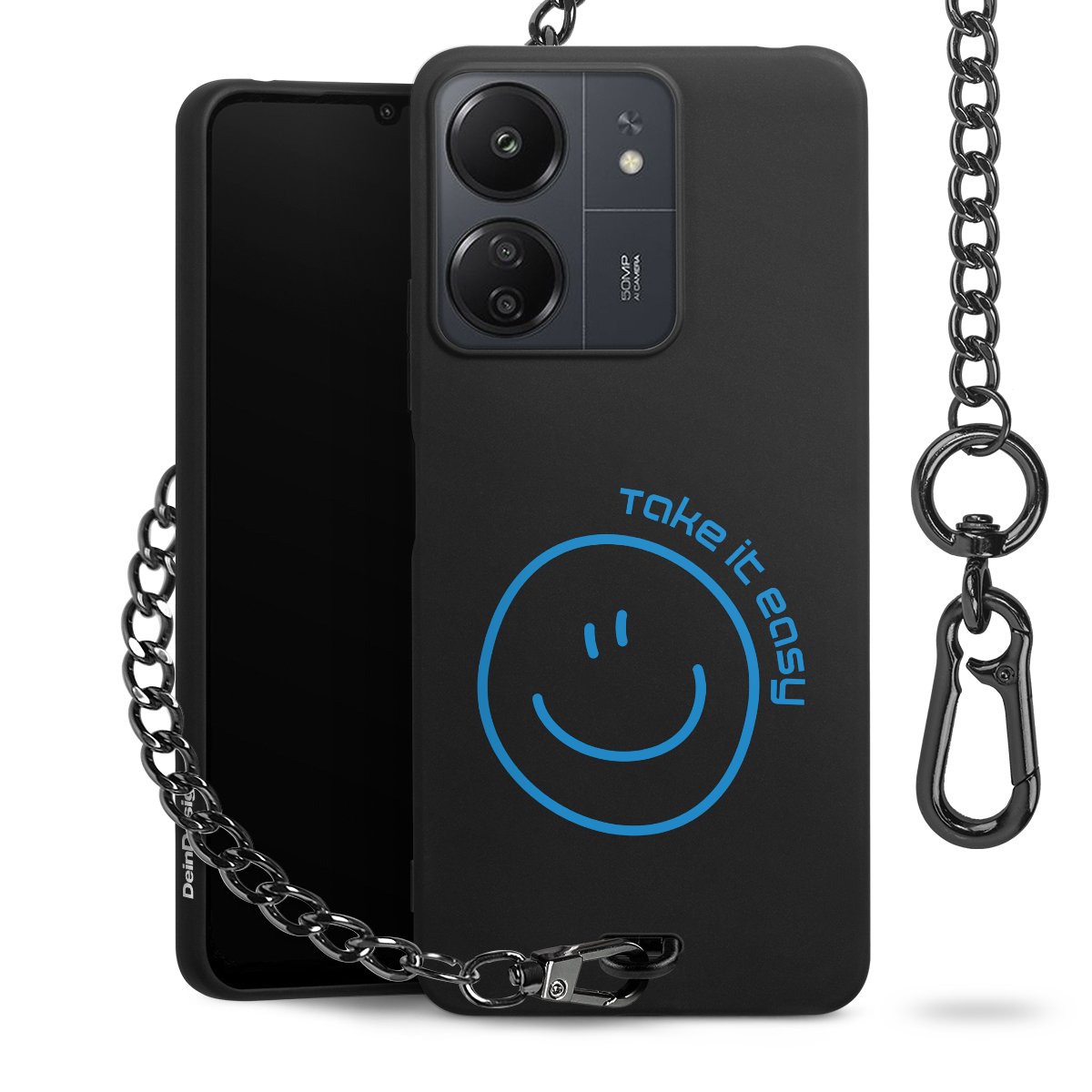 Die mattschwarze Silikon-Handyhülle besteht aus robustem TPU (thermoplastisches Polyurethan). Sie ist flexibel und schützt Dein Smartphone vor Stößen und Kratzern. Die Kette sowie der Karabinerhaken sind aus Metall in Gunmetal-Optik gefertigt. Für dieses Produkt kommen ausschließlich TÜV-geprüfte Materialien zum Einsatz.