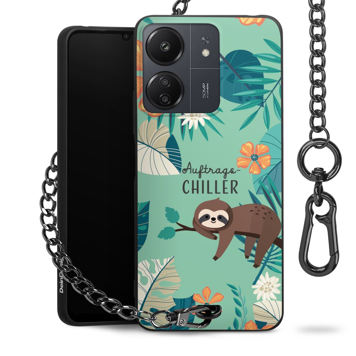 Die mattschwarze Silikon-Handyhülle besteht aus robustem TPU (thermoplastisches Polyurethan). Sie ist flexibel und schützt Dein Smartphone vor Stößen und Kratzern. Die Kette sowie der Karabinerhaken sind aus Metall in Gunmetal-Optik gefertigt. Für dieses Produkt kommen ausschließlich TÜV-geprüfte Materialien zum Einsatz.