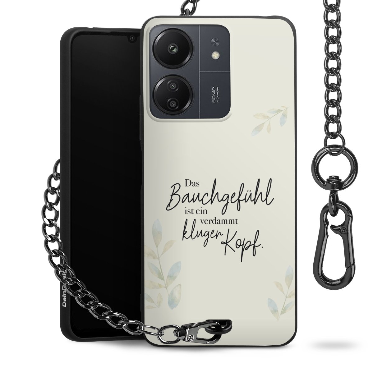 Die mattschwarze Silikon-Handyhülle besteht aus robustem TPU (thermoplastisches Polyurethan). Sie ist flexibel und schützt Dein Smartphone vor Stößen und Kratzern. Die Kette sowie der Karabinerhaken sind aus Metall in Gunmetal-Optik gefertigt. Für dieses Produkt kommen ausschließlich TÜV-geprüfte Materialien zum Einsatz.
