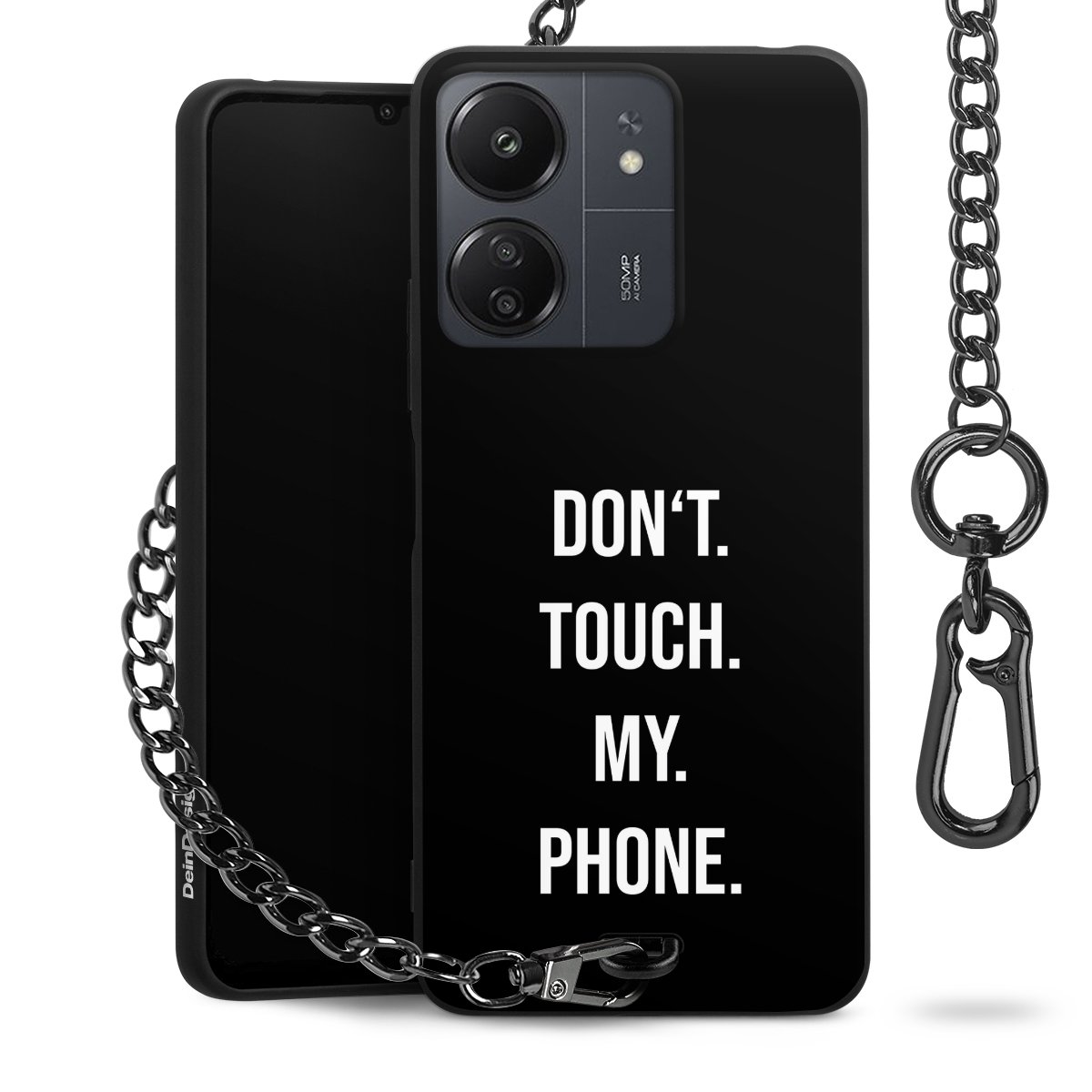 Die mattschwarze Silikon-Handyhülle besteht aus robustem TPU (thermoplastisches Polyurethan). Sie ist flexibel und schützt Dein Smartphone vor Stößen und Kratzern. Die Kette sowie der Karabinerhaken sind aus Metall in Gunmetal-Optik gefertigt. Für dieses Produkt kommen ausschließlich TÜV-geprüfte Materialien zum Einsatz.