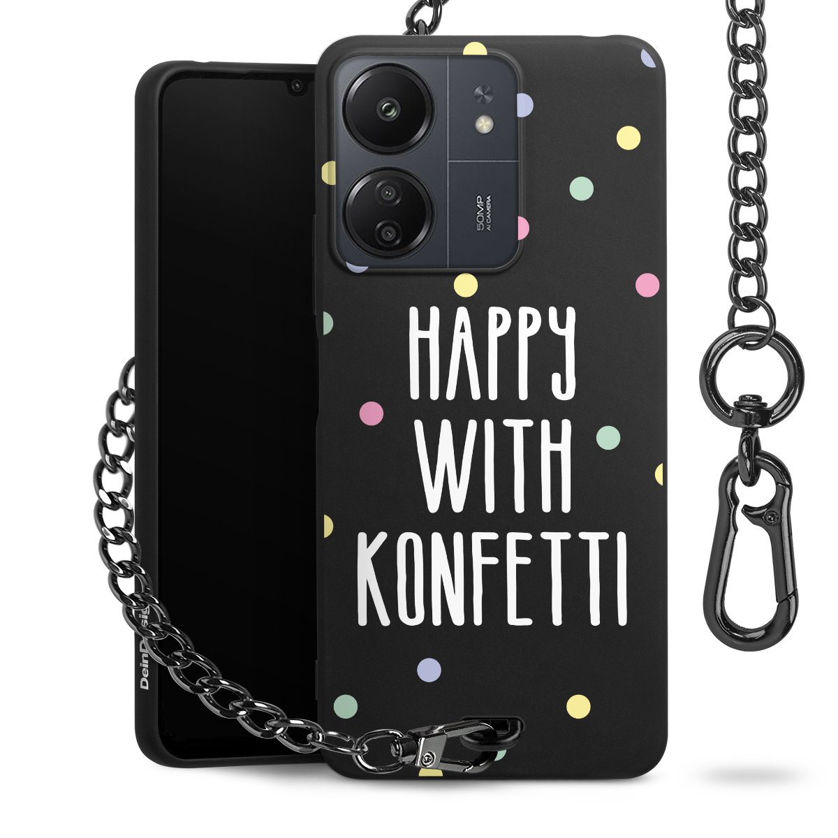 Die mattschwarze Silikon-Handyhülle besteht aus robustem TPU (thermoplastisches Polyurethan). Sie ist flexibel und schützt Dein Smartphone vor Stößen und Kratzern. Die Kette sowie der Karabinerhaken sind aus Metall in Gunmetal-Optik gefertigt. Für dieses Produkt kommen ausschließlich TÜV-geprüfte Materialien zum Einsatz.
