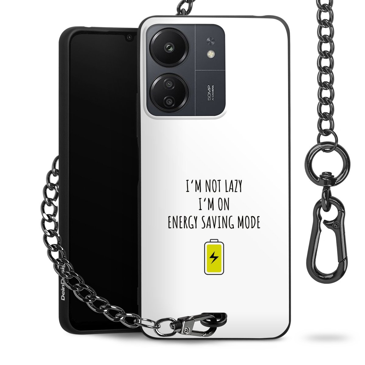 Die mattschwarze Silikon-Handyhülle besteht aus robustem TPU (thermoplastisches Polyurethan). Sie ist flexibel und schützt Dein Smartphone vor Stößen und Kratzern. Die Kette sowie der Karabinerhaken sind aus Metall in Gunmetal-Optik gefertigt. Für dieses Produkt kommen ausschließlich TÜV-geprüfte Materialien zum Einsatz.