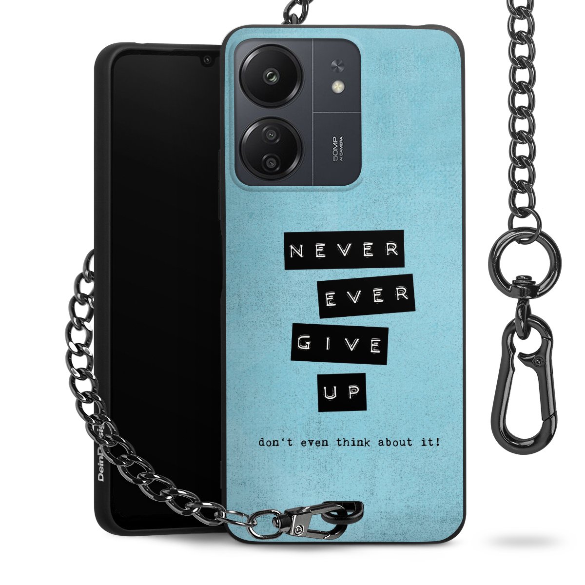 Die Handyhülle verfügt über eine mittig am unteren Rand platzierte Öse, an der die Metallkette stabil befestigt ist. Bestelle die Hülle einfach für Dein Smartphone-Modell, dann passt sie wie angegossen und Du brauchst sie bloß einmal anzudrücken. Handy in die Tasche, Karabiner an den Hosenbund – schon kann die Party starten.