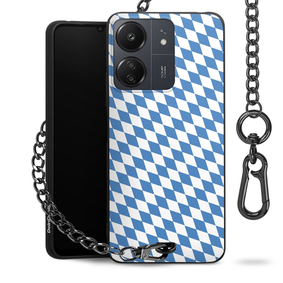 Die mattschwarze Silikon-Handyhülle besteht aus robustem TPU (thermoplastisches Polyurethan). Sie ist flexibel und schützt Dein Smartphone vor Stößen und Kratzern. Die Kette sowie der Karabinerhaken sind aus Metall in Gunmetal-Optik gefertigt. Für dieses Produkt kommen ausschließlich TÜV-geprüfte Materialien zum Einsatz.