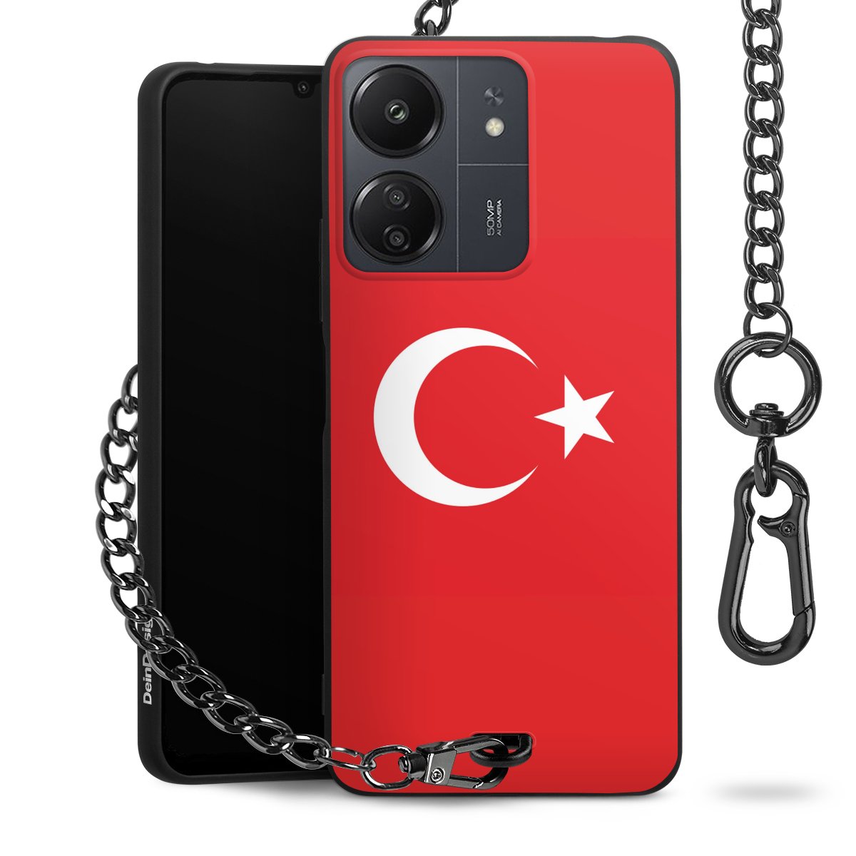 Die mattschwarze Silikon-Handyhülle besteht aus robustem TPU (thermoplastisches Polyurethan). Sie ist flexibel und schützt Dein Smartphone vor Stößen und Kratzern. Die Kette sowie der Karabinerhaken sind aus Metall in Gunmetal-Optik gefertigt. Für dieses Produkt kommen ausschließlich TÜV-geprüfte Materialien zum Einsatz.