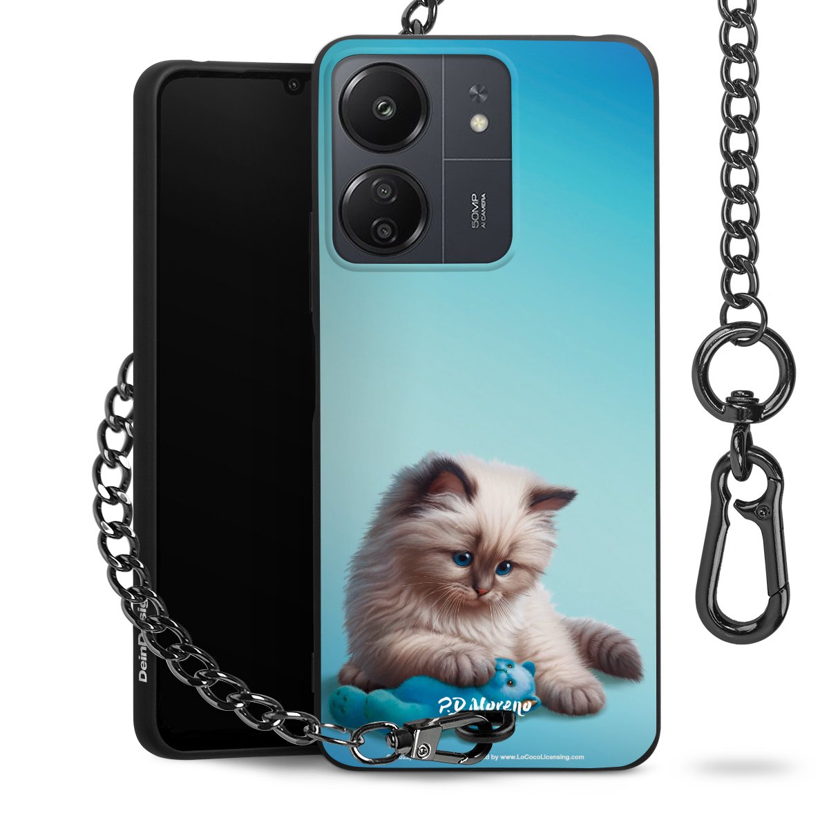 Die mattschwarze Silikon-Handyhülle besteht aus robustem TPU (thermoplastisches Polyurethan). Sie ist flexibel und schützt Dein Smartphone vor Stößen und Kratzern. Die Kette sowie der Karabinerhaken sind aus Metall in Gunmetal-Optik gefertigt. Für dieses Produkt kommen ausschließlich TÜV-geprüfte Materialien zum Einsatz.
