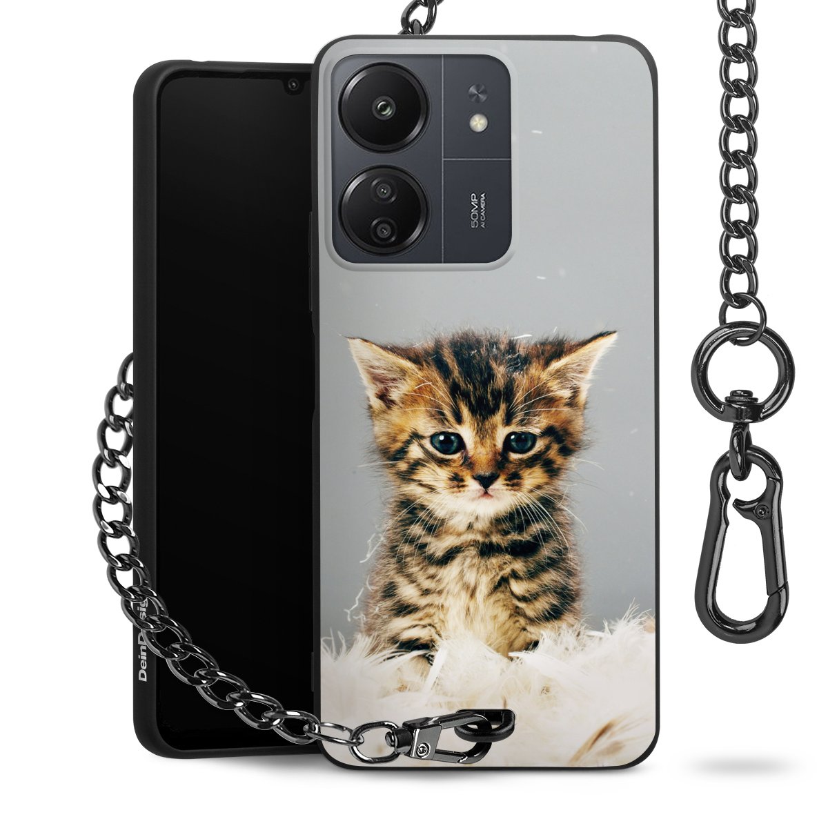 Die mattschwarze Silikon-Handyhülle besteht aus robustem TPU (thermoplastisches Polyurethan). Sie ist flexibel und schützt Dein Smartphone vor Stößen und Kratzern. Die Kette sowie der Karabinerhaken sind aus Metall in Gunmetal-Optik gefertigt. Für dieses Produkt kommen ausschließlich TÜV-geprüfte Materialien zum Einsatz.