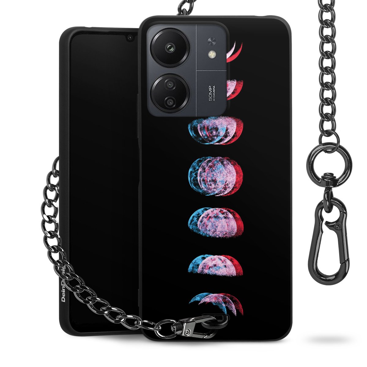 Die Handyhülle verfügt über eine mittig am unteren Rand platzierte Öse, an der die Metallkette stabil befestigt ist. Bestelle die Hülle einfach für Dein Smartphone-Modell, dann passt sie wie angegossen und Du brauchst sie bloß einmal anzudrücken. Handy in die Tasche, Karabiner an den Hosenbund – schon kann die Party starten.