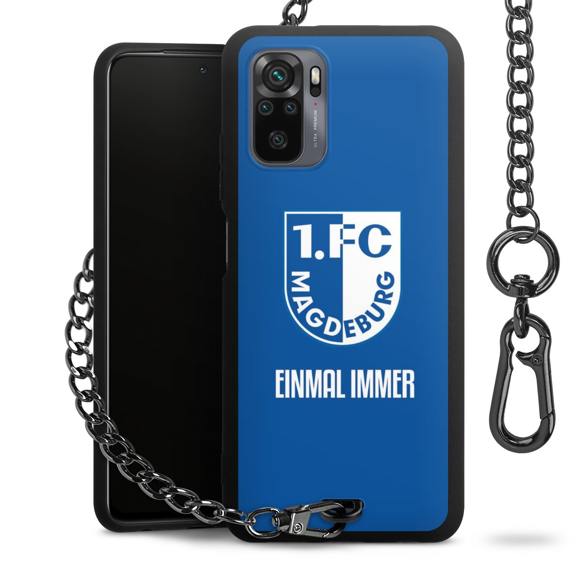 Die Handyhülle verfügt über eine mittig am unteren Rand platzierte Öse, an der die Metallkette stabil befestigt ist. Bestelle die Hülle einfach für Dein Smartphone-Modell, dann passt sie wie angegossen und Du brauchst sie bloß einmal anzudrücken. Handy in die Tasche, Karabiner an den Hosenbund – schon kann die Party starten.