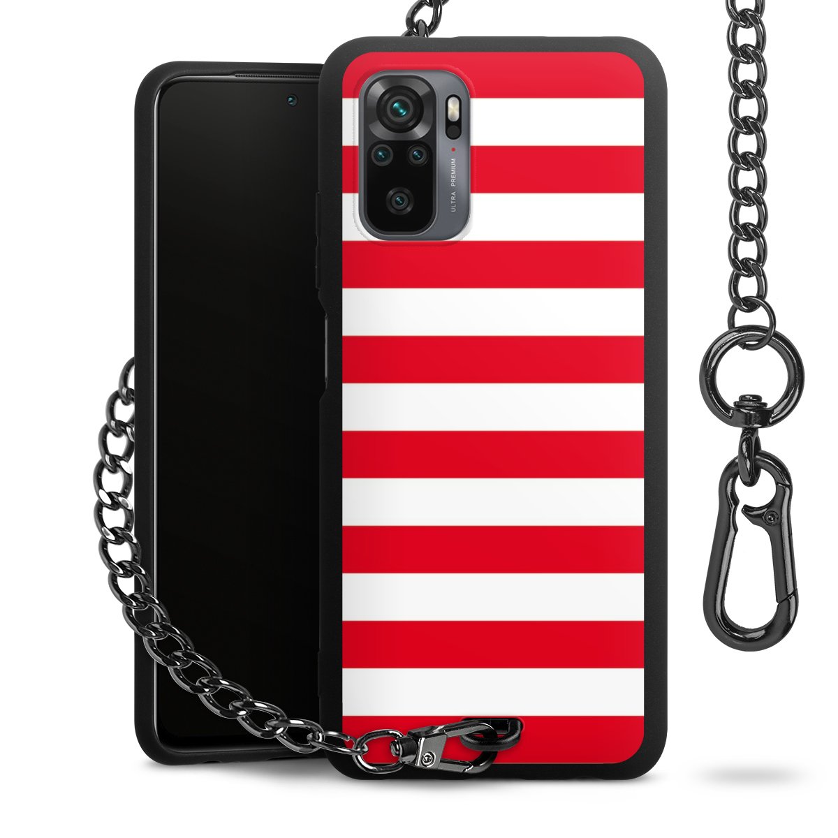Die mattschwarze Silikon-Handyhülle besteht aus robustem TPU (thermoplastisches Polyurethan). Sie ist flexibel und schützt Dein Smartphone vor Stößen und Kratzern. Die Kette sowie der Karabinerhaken sind aus Metall in Gunmetal-Optik gefertigt. Für dieses Produkt kommen ausschließlich TÜV-geprüfte Materialien zum Einsatz.