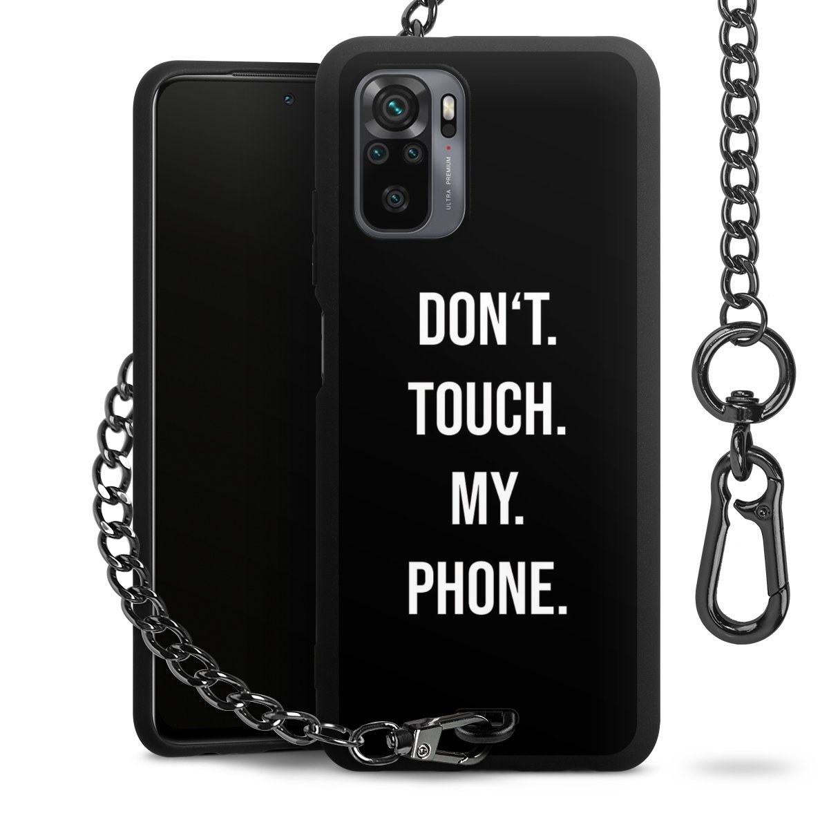 Die mattschwarze Silikon-Handyhülle besteht aus robustem TPU (thermoplastisches Polyurethan). Sie ist flexibel und schützt Dein Smartphone vor Stößen und Kratzern. Die Kette sowie der Karabinerhaken sind aus Metall in Gunmetal-Optik gefertigt. Für dieses Produkt kommen ausschließlich TÜV-geprüfte Materialien zum Einsatz.
