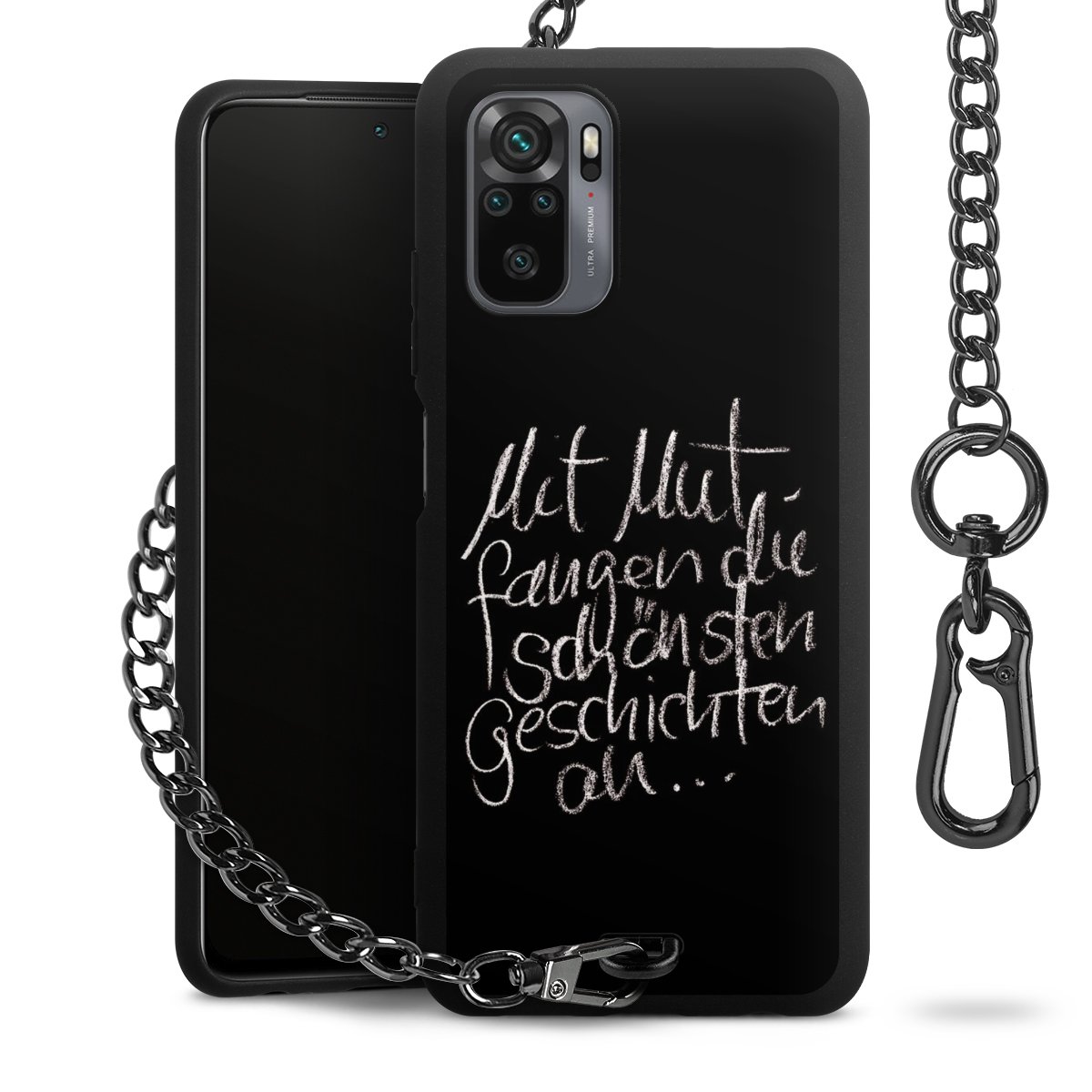 Die mattschwarze Silikon-Handyhülle besteht aus robustem TPU (thermoplastisches Polyurethan). Sie ist flexibel und schützt Dein Smartphone vor Stößen und Kratzern. Die Kette sowie der Karabinerhaken sind aus Metall in Gunmetal-Optik gefertigt. Für dieses Produkt kommen ausschließlich TÜV-geprüfte Materialien zum Einsatz.