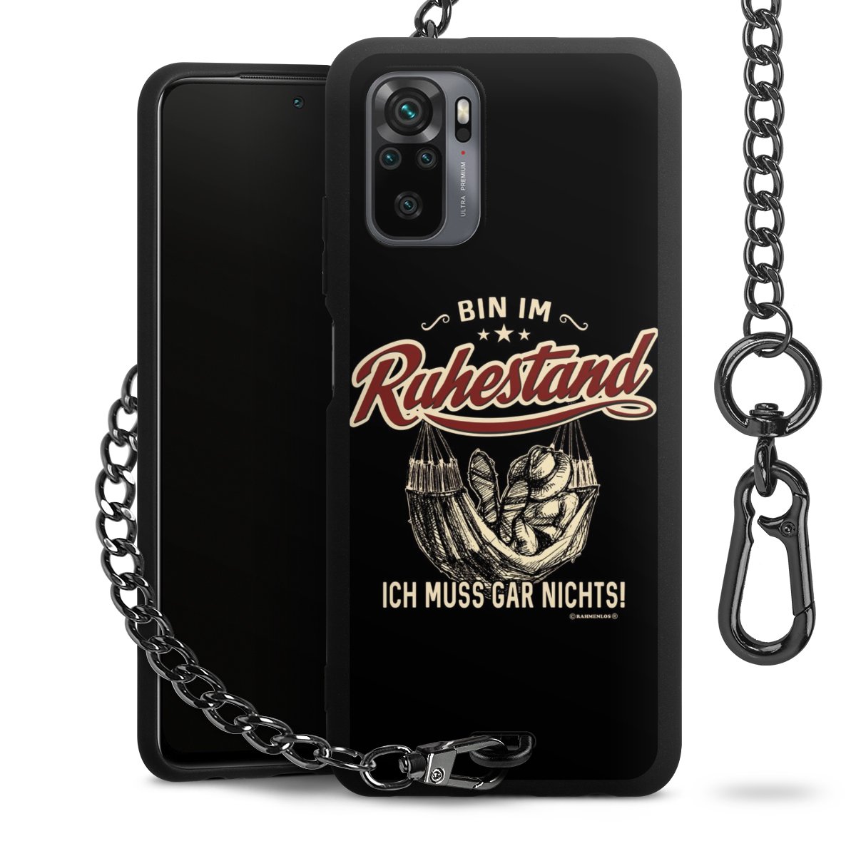 Die mattschwarze Silikon-Handyhülle besteht aus robustem TPU (thermoplastisches Polyurethan). Sie ist flexibel und schützt Dein Smartphone vor Stößen und Kratzern. Die Kette sowie der Karabinerhaken sind aus Metall in Gunmetal-Optik gefertigt. Für dieses Produkt kommen ausschließlich TÜV-geprüfte Materialien zum Einsatz.
