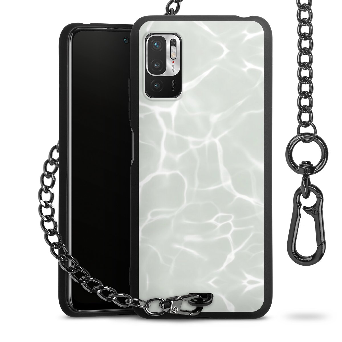 Die mattschwarze Silikon-Handyhülle besteht aus robustem TPU (thermoplastisches Polyurethan). Sie ist flexibel und schützt Dein Smartphone vor Stößen und Kratzern. Die Kette sowie der Karabinerhaken sind aus Metall in Gunmetal-Optik gefertigt. Für dieses Produkt kommen ausschließlich TÜV-geprüfte Materialien zum Einsatz.