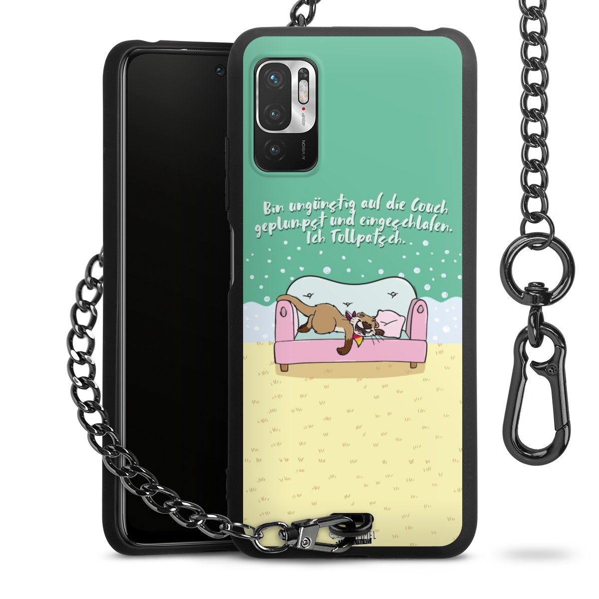 Die mattschwarze Silikon-Handyhülle besteht aus robustem TPU (thermoplastisches Polyurethan). Sie ist flexibel und schützt Dein Smartphone vor Stößen und Kratzern. Die Kette sowie der Karabinerhaken sind aus Metall in Gunmetal-Optik gefertigt. Für dieses Produkt kommen ausschließlich TÜV-geprüfte Materialien zum Einsatz.