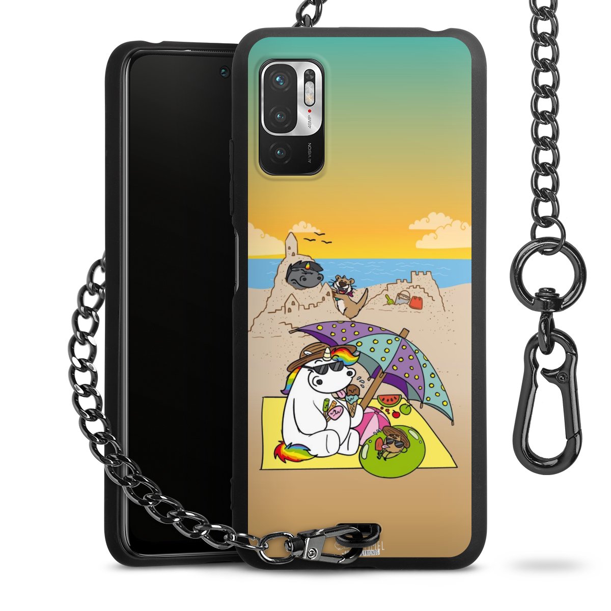Die Handyhülle verfügt über eine mittig am unteren Rand platzierte Öse, an der die Metallkette stabil befestigt ist. Bestelle die Hülle einfach für Dein Smartphone-Modell, dann passt sie wie angegossen und Du brauchst sie bloß einmal anzudrücken. Handy in die Tasche, Karabiner an den Hosenbund – schon kann die Party starten.