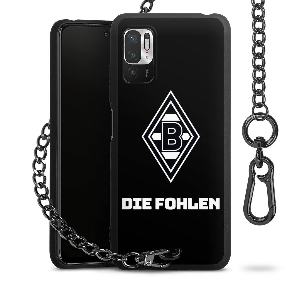 Die mattschwarze Silikon-Handyhülle besteht aus robustem TPU (thermoplastisches Polyurethan). Sie ist flexibel und schützt Dein Smartphone vor Stößen und Kratzern. Die Kette sowie der Karabinerhaken sind aus Metall in Gunmetal-Optik gefertigt. Für dieses Produkt kommen ausschließlich TÜV-geprüfte Materialien zum Einsatz.