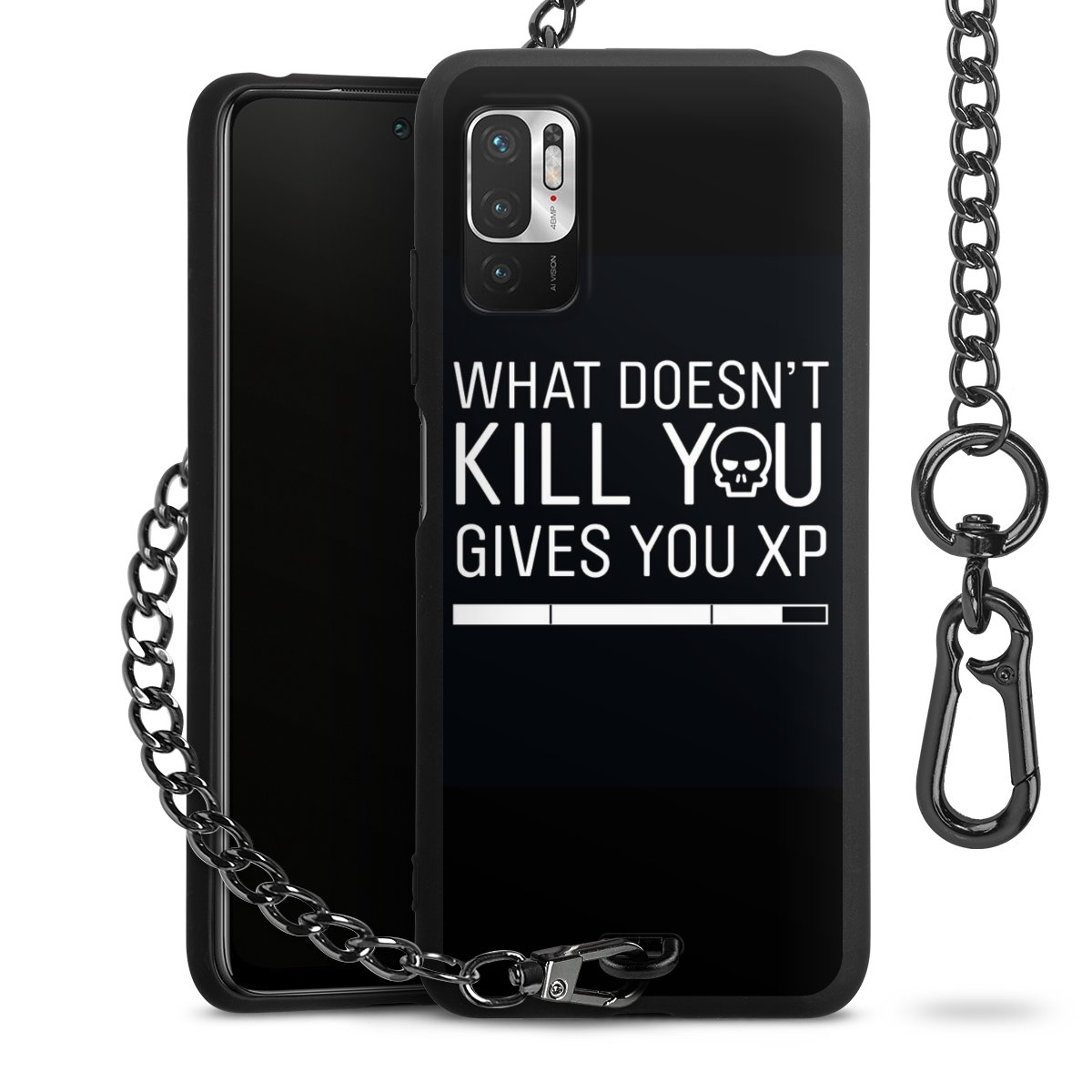 Die mattschwarze Silikon-Handyhülle besteht aus robustem TPU (thermoplastisches Polyurethan). Sie ist flexibel und schützt Dein Smartphone vor Stößen und Kratzern. Die Kette sowie der Karabinerhaken sind aus Metall in Gunmetal-Optik gefertigt. Für dieses Produkt kommen ausschließlich TÜV-geprüfte Materialien zum Einsatz.
