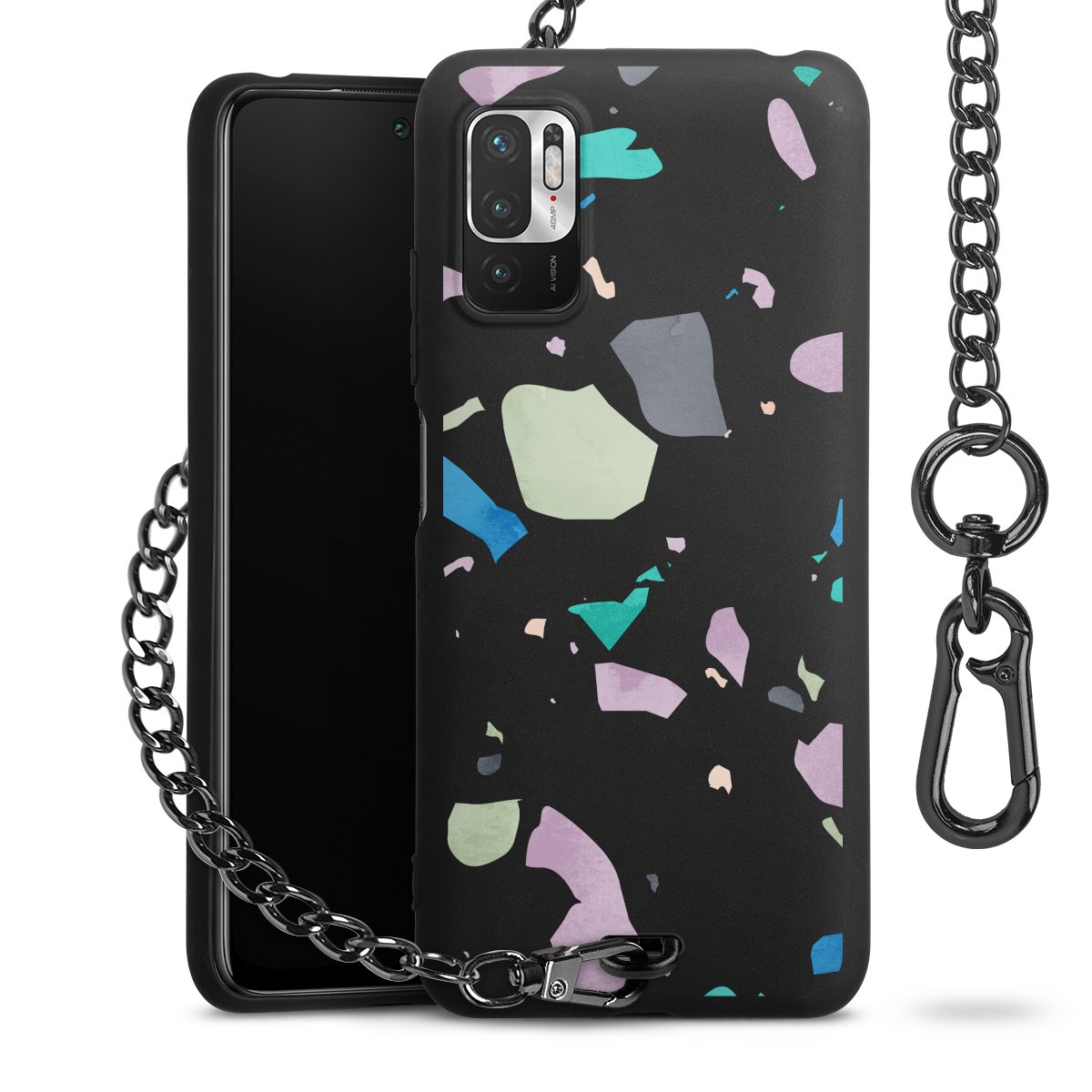 Die mattschwarze Silikon-Handyhülle besteht aus robustem TPU (thermoplastisches Polyurethan). Sie ist flexibel und schützt Dein Smartphone vor Stößen und Kratzern. Die Kette sowie der Karabinerhaken sind aus Metall in Gunmetal-Optik gefertigt. Für dieses Produkt kommen ausschließlich TÜV-geprüfte Materialien zum Einsatz.