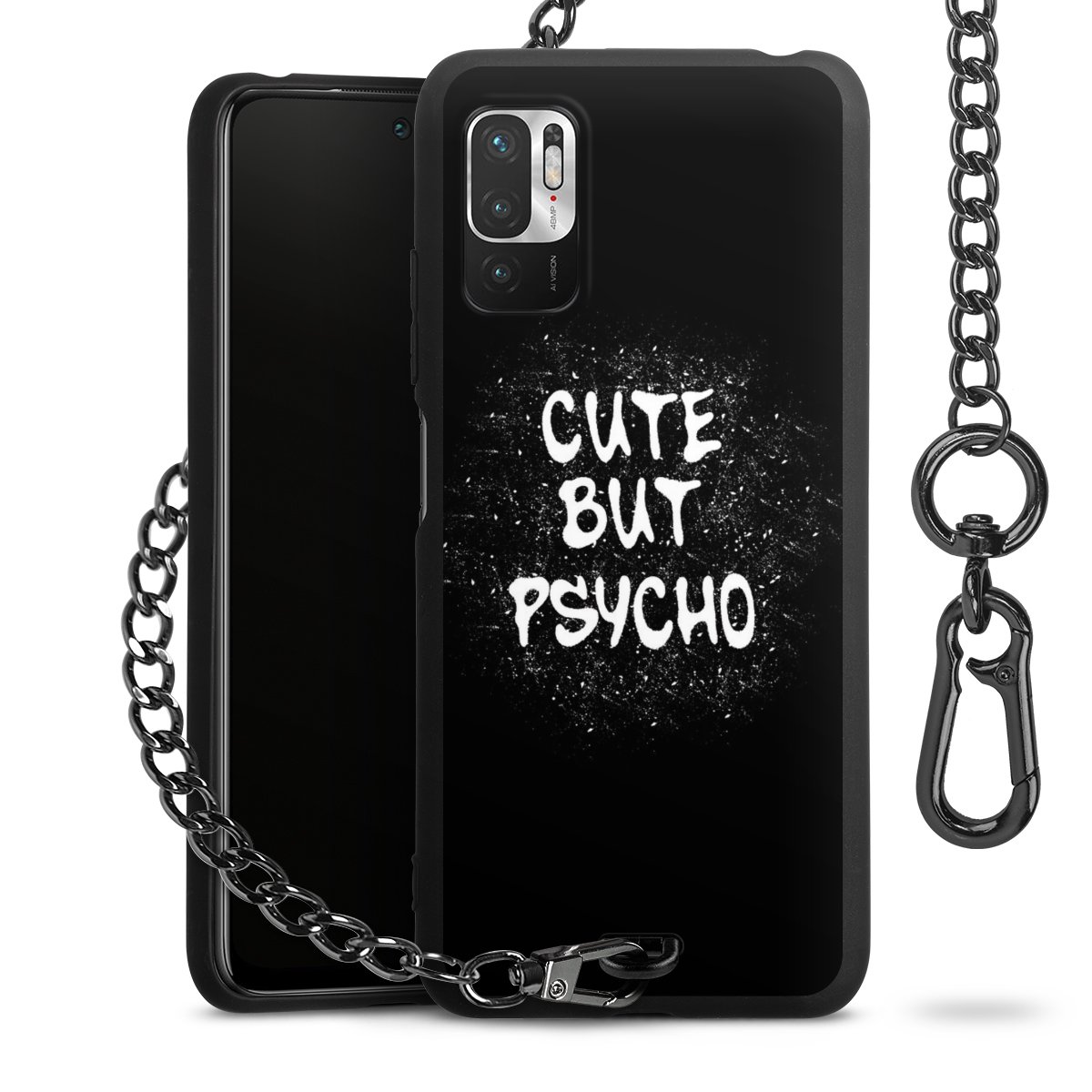 Die mattschwarze Silikon-Handyhülle besteht aus robustem TPU (thermoplastisches Polyurethan). Sie ist flexibel und schützt Dein Smartphone vor Stößen und Kratzern. Die Kette sowie der Karabinerhaken sind aus Metall in Gunmetal-Optik gefertigt. Für dieses Produkt kommen ausschließlich TÜV-geprüfte Materialien zum Einsatz.