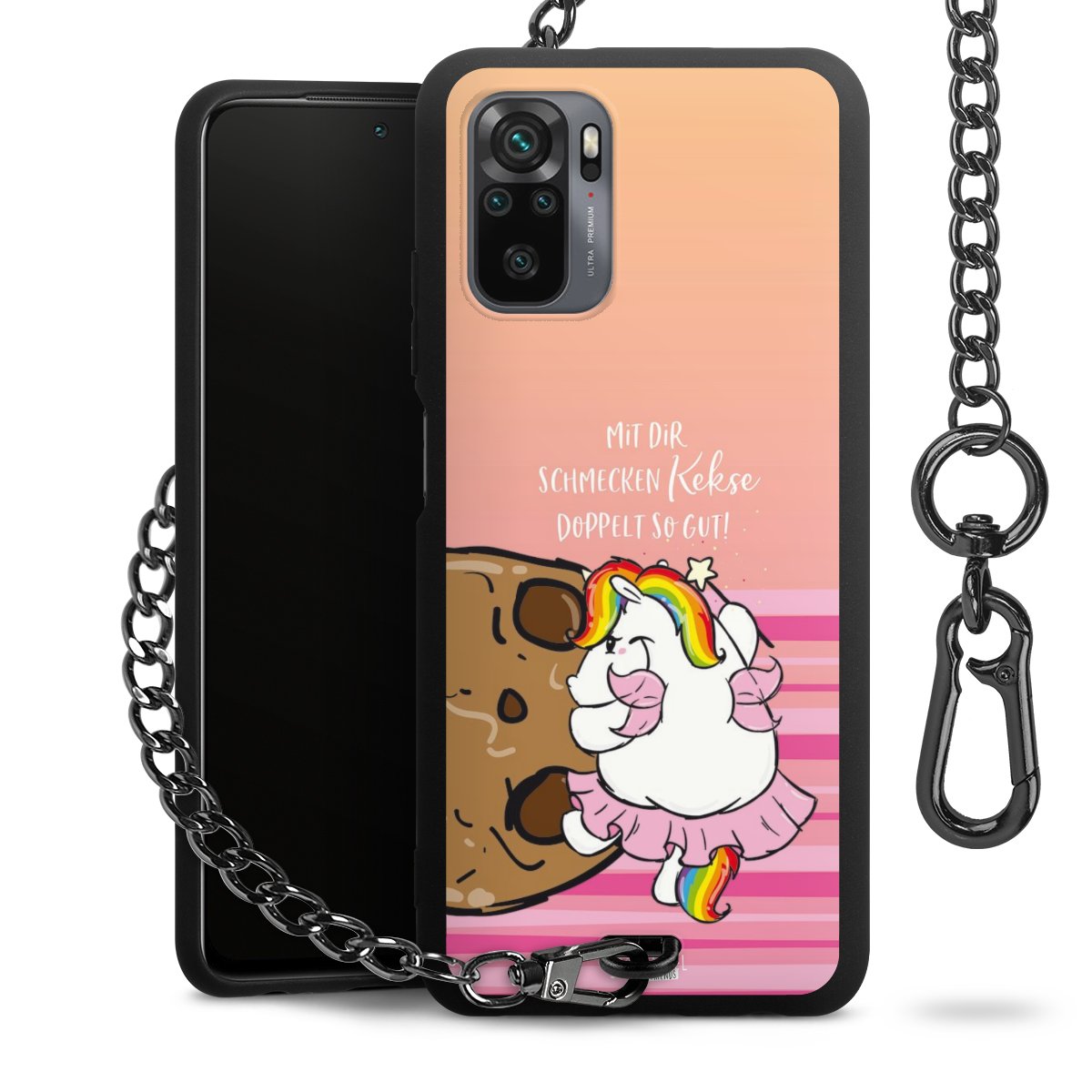 Die mattschwarze Silikon-Handyhülle besteht aus robustem TPU (thermoplastisches Polyurethan). Sie ist flexibel und schützt Dein Smartphone vor Stößen und Kratzern. Die Kette sowie der Karabinerhaken sind aus Metall in Gunmetal-Optik gefertigt. Für dieses Produkt kommen ausschließlich TÜV-geprüfte Materialien zum Einsatz.