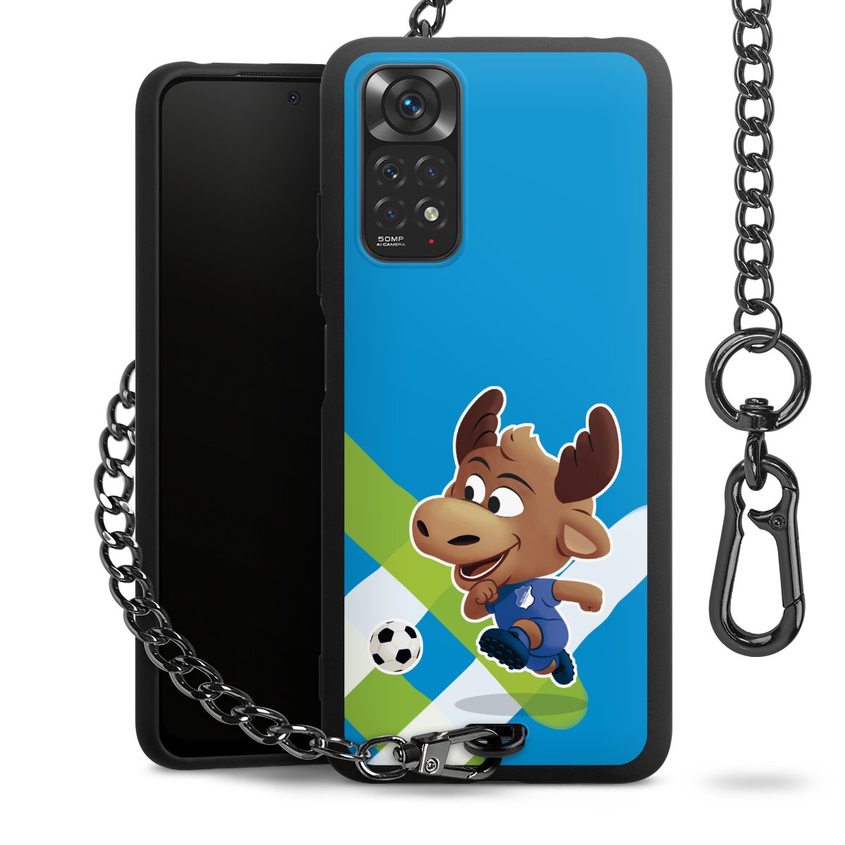 Die Handyhülle verfügt über eine mittig am unteren Rand platzierte Öse, an der die Metallkette stabil befestigt ist. Bestelle die Hülle einfach für Dein Smartphone-Modell, dann passt sie wie angegossen und Du brauchst sie bloß einmal anzudrücken. Handy in die Tasche, Karabiner an den Hosenbund – schon kann die Party starten.