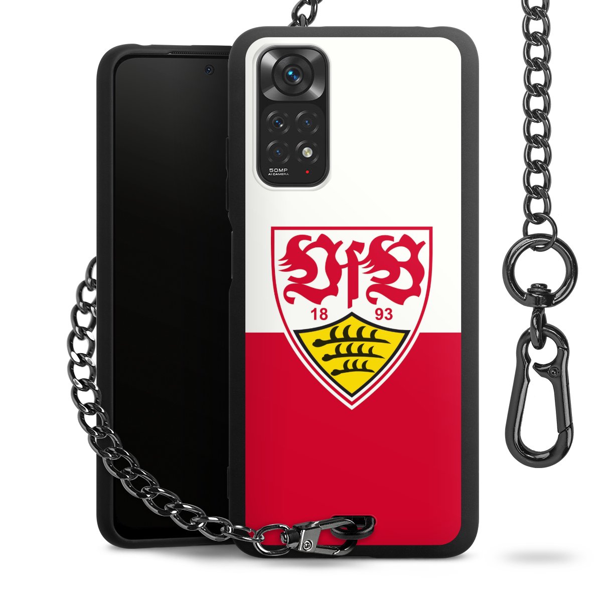 Die mattschwarze Silikon-Handyhülle besteht aus robustem TPU (thermoplastisches Polyurethan). Sie ist flexibel und schützt Dein Smartphone vor Stößen und Kratzern. Die Kette sowie der Karabinerhaken sind aus Metall in Gunmetal-Optik gefertigt. Für dieses Produkt kommen ausschließlich TÜV-geprüfte Materialien zum Einsatz.