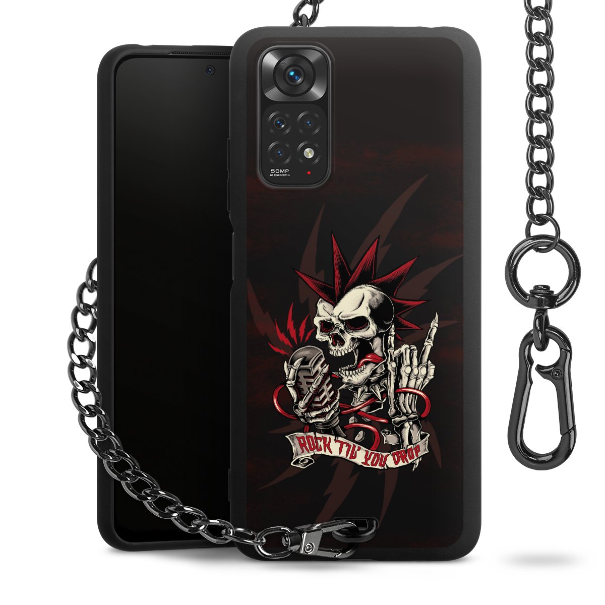 Die mattschwarze Silikon-Handyhülle besteht aus robustem TPU (thermoplastisches Polyurethan). Sie ist flexibel und schützt Dein Smartphone vor Stößen und Kratzern. Die Kette sowie der Karabinerhaken sind aus Metall in Gunmetal-Optik gefertigt. Für dieses Produkt kommen ausschließlich TÜV-geprüfte Materialien zum Einsatz.